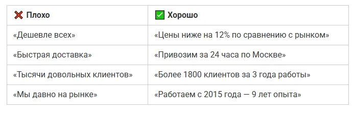 Пример: «Отвечаем на заявки за 5 минут — клиенты часто говорят, что с нами проще всего связаться».