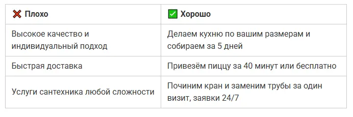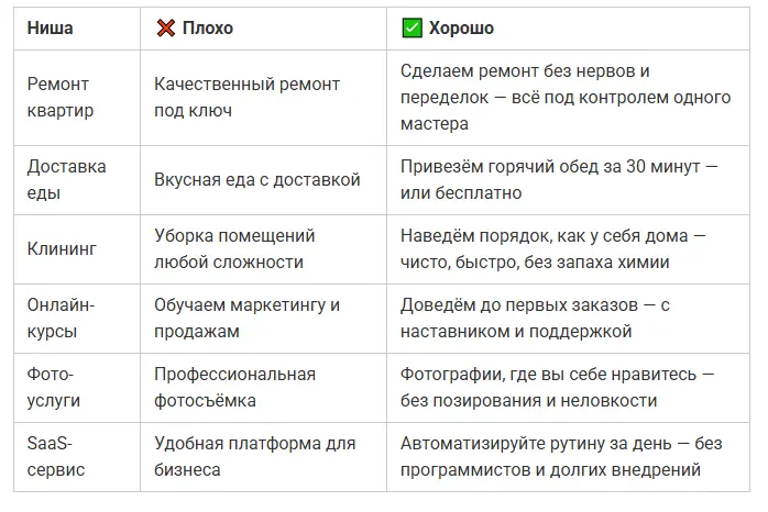 Чтобы увидеть разницу на практике, вот короткая таблица с примерами из разных ниш. В левой колонке — шаблонные и слабые формулировки, в правой — живые и понятные варианты, которые реально цепляют внимание.