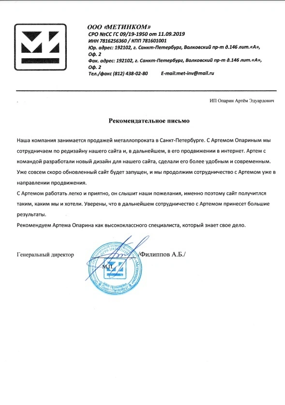 Наша компания занимается продажей металлопроката в Санкт-Петербурге. С Артемом Опариным мы сотрудничаем по редизайну нашего сайта и, в дальнейшем, в его продвижении в интернет. Артем с командой разработали новый дизайн для нашего сайта, сделали его более удобным и современным. Уже совсем скоро обновленный сайт будет запущен, и мы продолжим сотрудничество с Артемом уже в направлении продвижения.