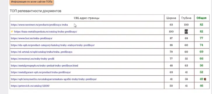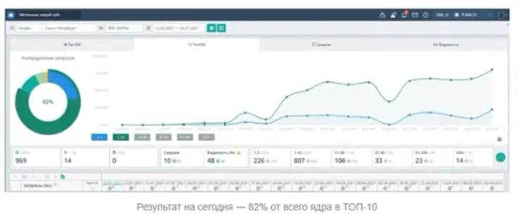 На данный момент основное семантическое ядро проекта, составляющее 82% от общего объема, находится в топ-10 выдачи Яндекса. Такие ключевые запросы, как "труба профильная", "труба профильная купить" и другие коммерческие фразы, занимают лидирующие позиции, обеспечивая стабильный приток целевого трафика.