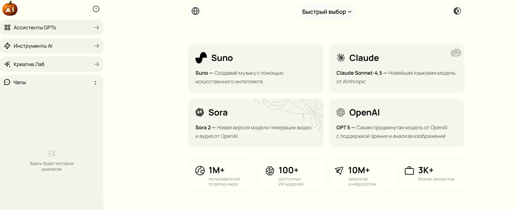 - доступ к 100+ нейросетям в одном интерфейсе: ChatGPT (GPT-5, GPT-4o, o1), Claude 4, Gemini 2.5, DeepSeek V3;