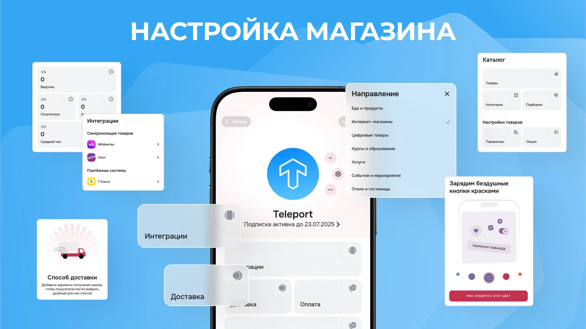 Благодаря удобному конструктору Teleport можно без помощи специалистов оформить стильную посадочную страницу бренда, добавить каталог товаров и настроить различные варианты оформления заказов.