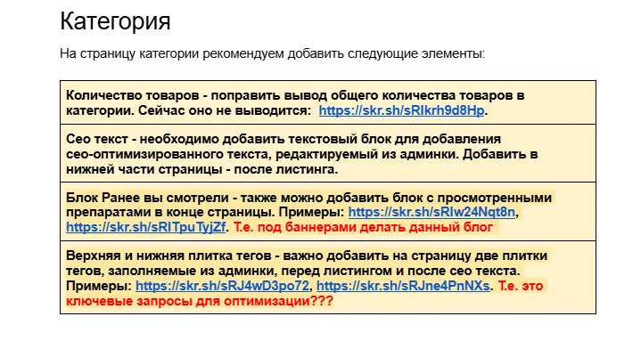 Вторым критически важным этапом оптимизации стало создание отдельных страниц для всех категорий товаров на сайте аптеки. В исходном состоянии реализация категорий была организована через систему фильтров в каталоге, когда при выборе параметров типа «Форма выпуска», «Производитель» и т.п. пользователю отдавались товары, подпадающие под указанные условия. Сами же категории как полноценные логические разделы не были реализованы в виде отдельных страниц.