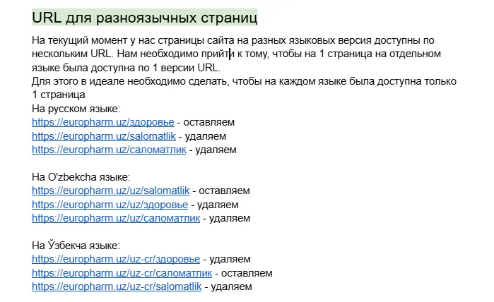 Первым важнейшим шагом стало наведение порядка в технической реализации сайта. Совместно с разработчиками была проведена колоссальная работа по исправлению критической ошибки, связанной с дублированием страниц.