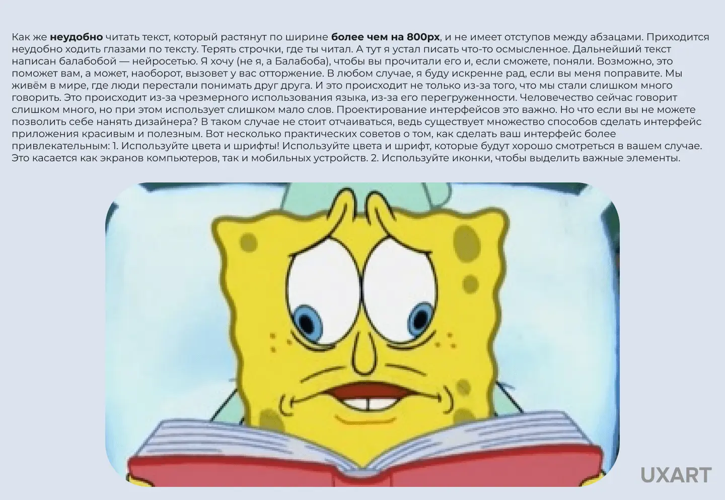 Про ширину контента — супер важный пункт. Многие им пренебрегают и получаются вот такие тексты. Боль.