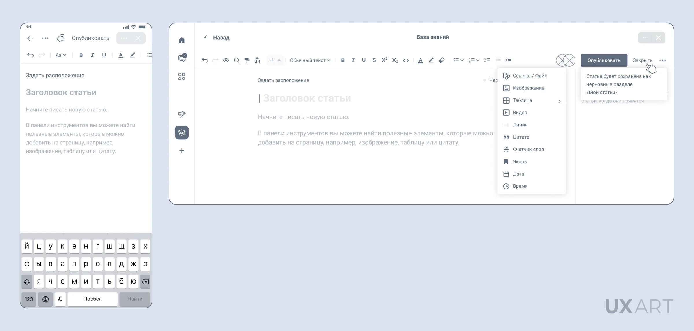 Основное действие в базе знаний для автора — создание статьи. Поэтому проработали редактор статьей и сделали его удобнее, в том числе и для мобильных.