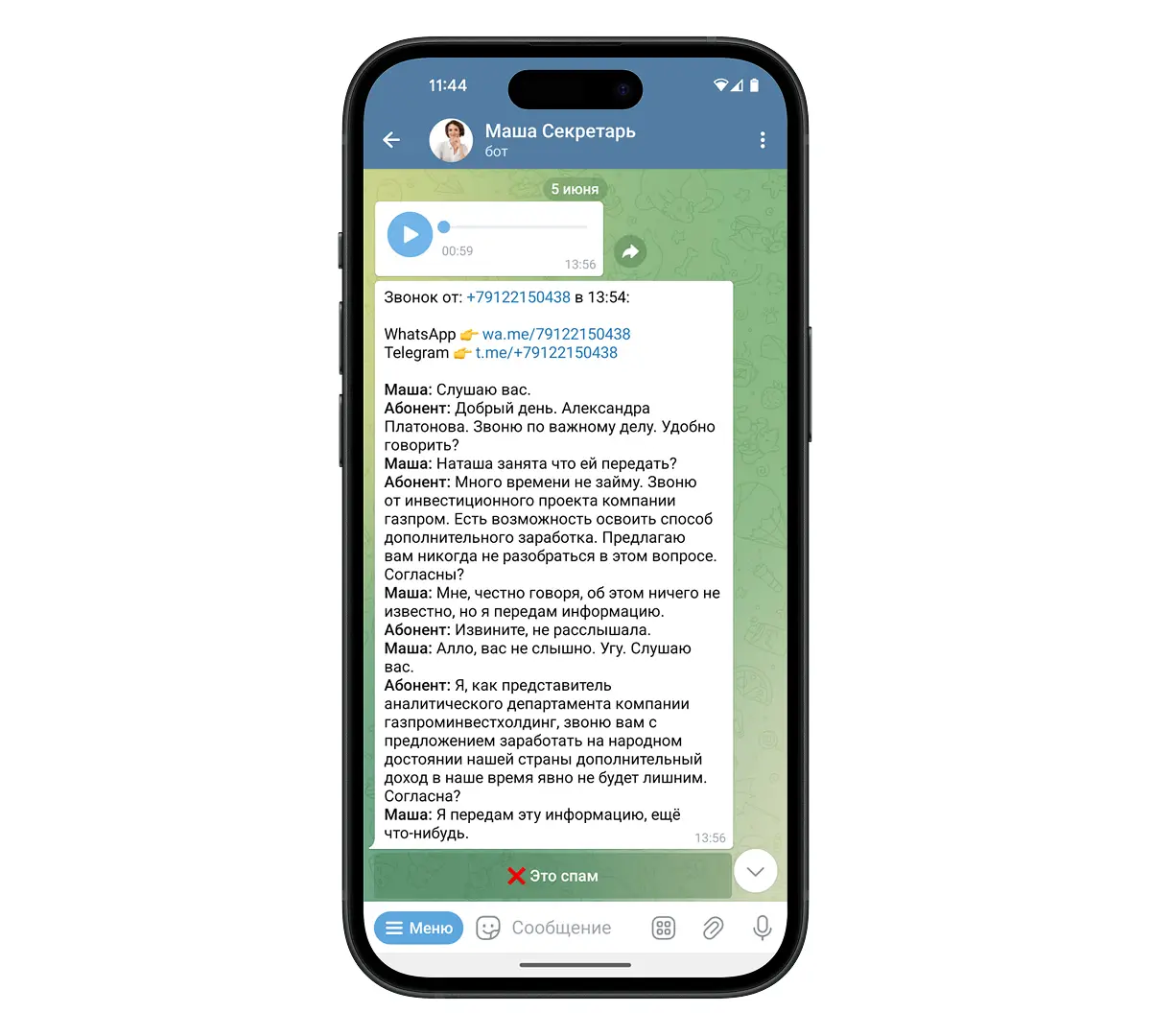 Я отвечу на звонок за вас, узнаю его цель. Потом отправлю вам в Telegram запись и текстовую расшифровку разговора, чтобы вы могли оценить, похоже это на спам и мошенничество или стоит перезвонить.