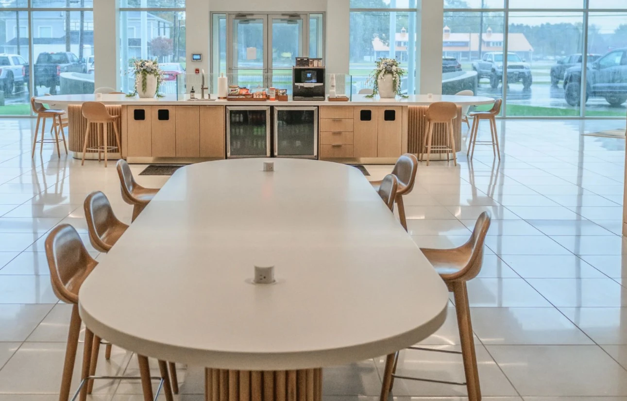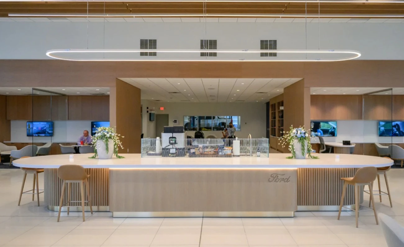 Новый дизайн выставочного зала сочетает в себе традиционное офисное пространство («зал для покупок») и то, что Ford называет «зонами гостеприимства», то есть открытые помещения в стиле конференц-центров, в которых можно разместить интерактивные дисплеи, зоны отдыха или пространства для совместной работы. Даже в дилерских центрах проводятся встречи, верно?