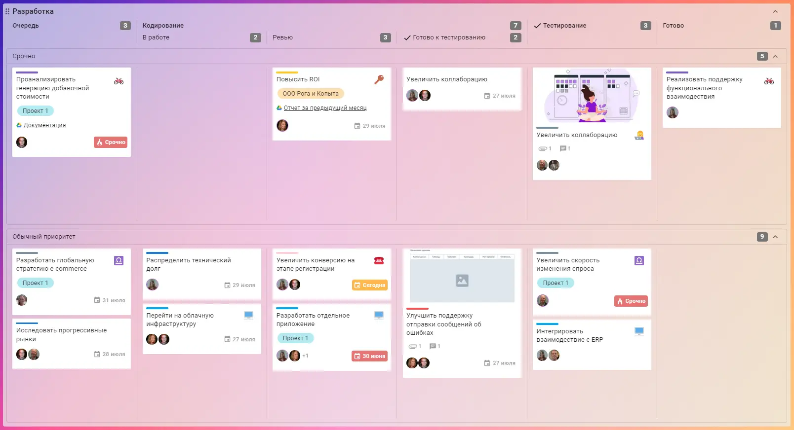 - Командная работа. Платформа обеспечивает полную прозрачность: каждый сотрудник видит, над чем работают коллеги. У заданий есть понятные статусы, фильтры, сортировка и поиск, что упрощает навигацию даже при большом количестве проектов. Kaiten подходит как для небольших стартапов, так и для крупных распределенных команд — система гибко подстраивается под формат работы.