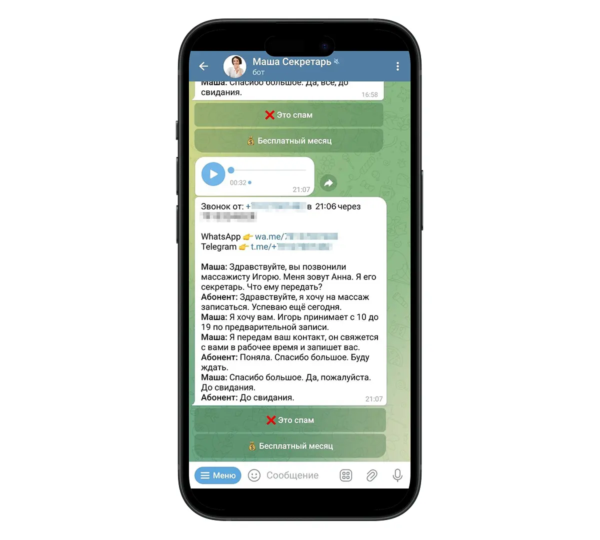 ● Отчет о звонке приходит в Телеграм. Игорь может оценить срочность вопроса и перезвонить позже.