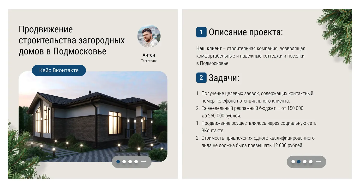 «Привет! Меня зовут Антон, я таргетолог. Помогаю привлекать заявки из соцсетей. В кейсе хочу рассказать, как я продвигаю проект по строительству загородных коттеджей во ВКонтакте и привожу клиентам заявки от 800 до 1500 руб. за лид, и от 4000 до 8000 руб. за квалифицированный лид!»