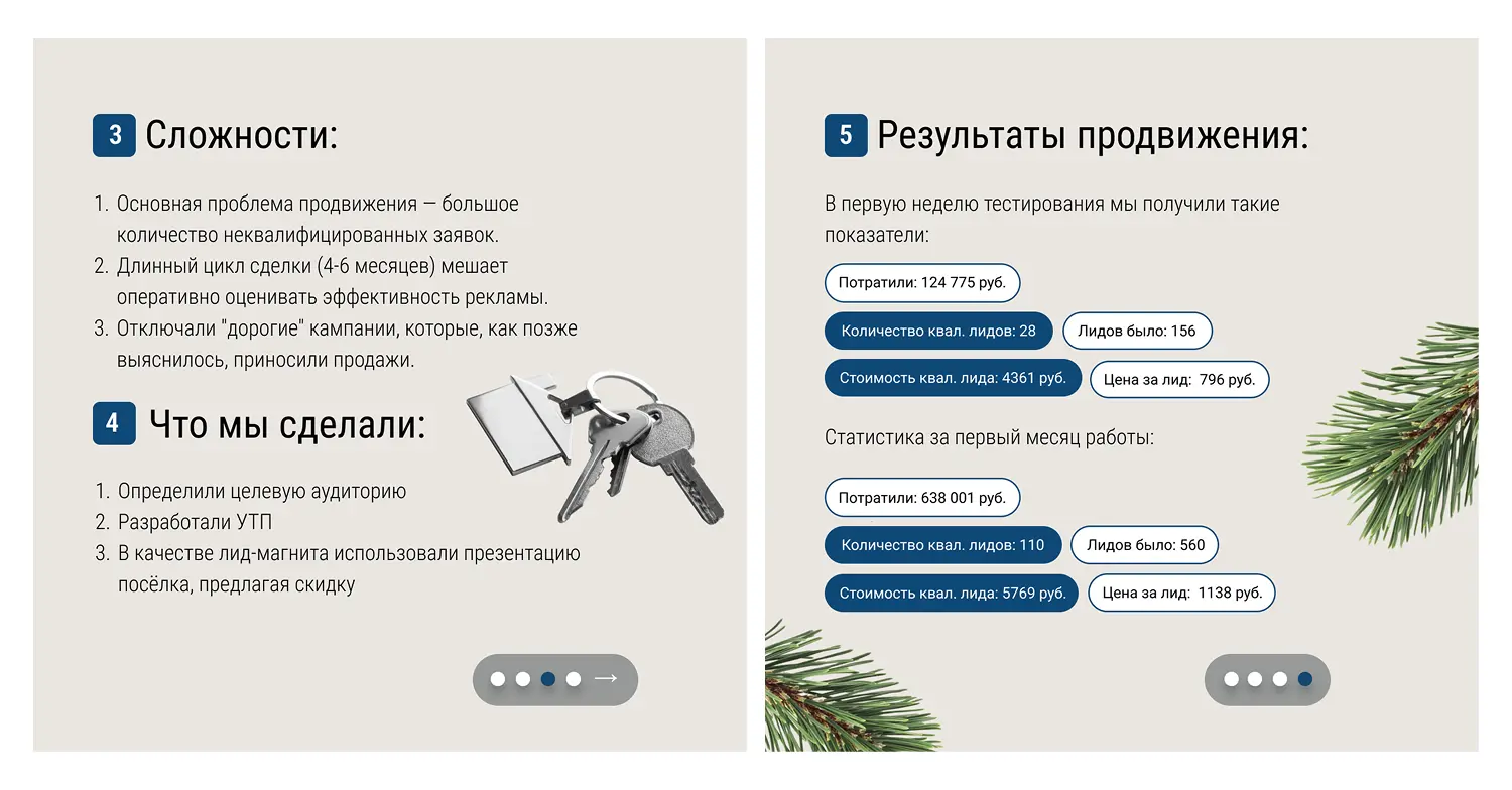 В качестве лид-магнита использовали презентацию поселка и закреплением за номером скидки: