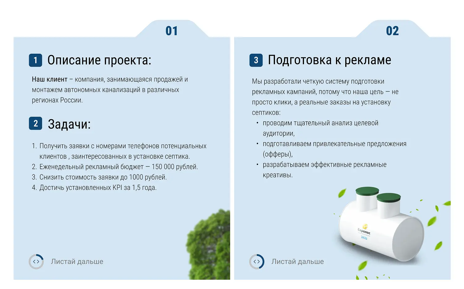 Мы разработали четкую систему подготовки рекламных кампаний, потому что наша цель — не просто клики, а реальные заказы на установку септиков.