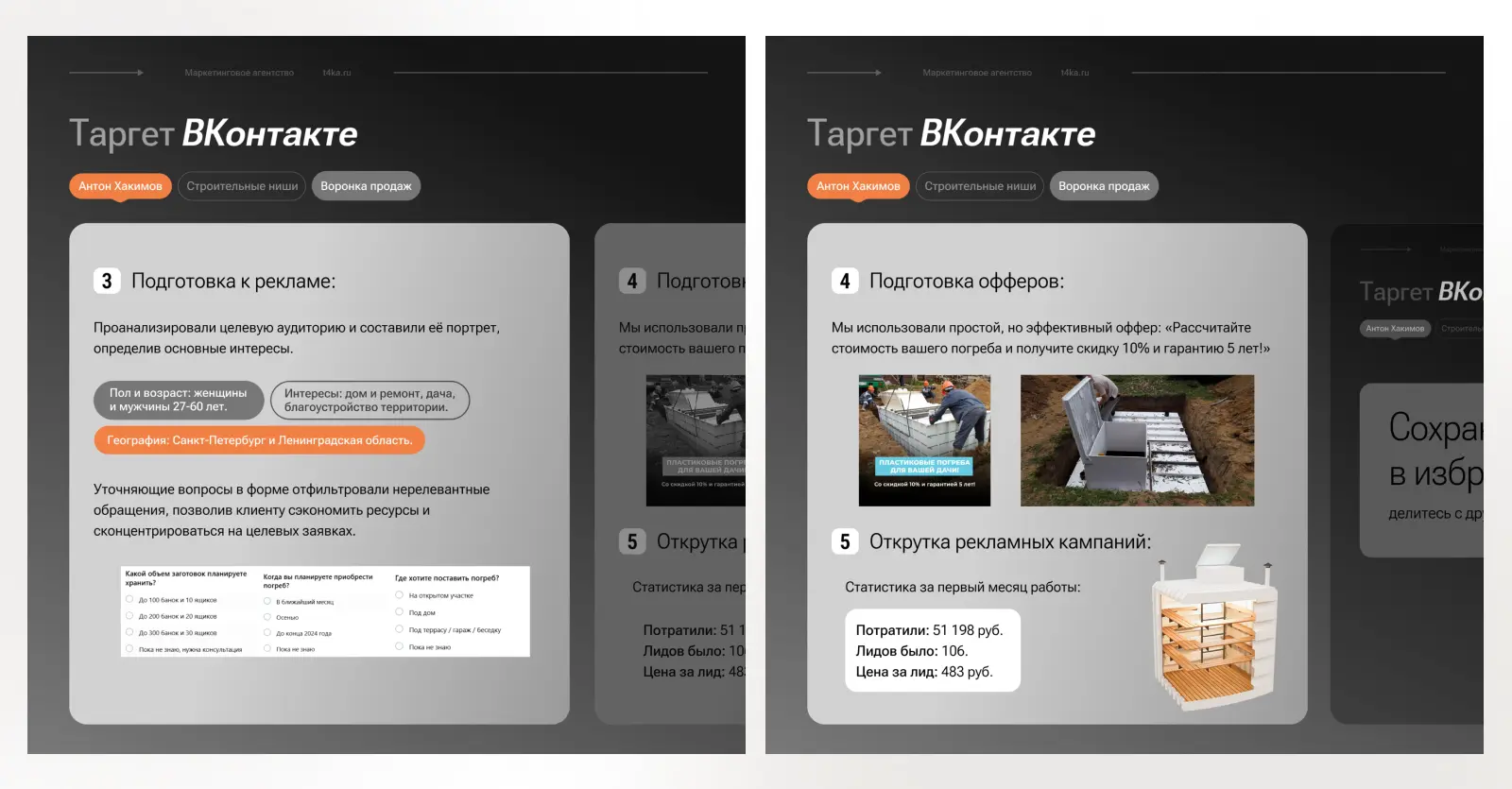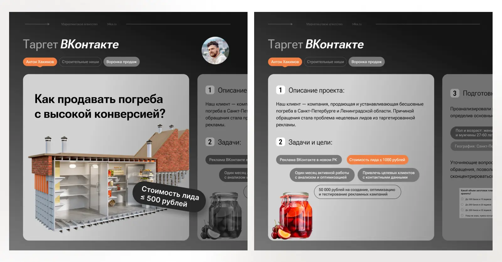 В разгар строительного сезона к нам обратилась компания, устанавливающая бесшовные пластиковые погреба в Санкт-Петербурге и Ленинградской области. Их маркетолог поставил перед нами задачу — разработать эффективную воронку продаж через социальные сети, сосредоточив внимание на уникальных пластиковых погребах. Ранее они уже тестировали таргет ВК, но получали лишь поток нецелевых лидов.