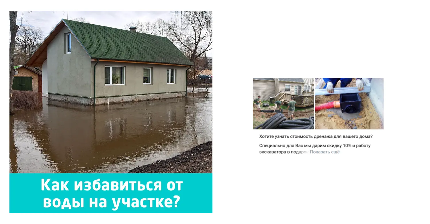 Для решения основной проблемы с дорогими заявками, мы решили более качественно поработать с «болями» в объявлениях. На креативах нужно было продемонстрировать основную проблему - затопление участка!