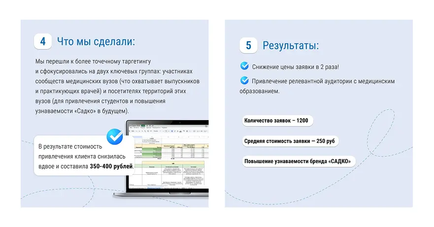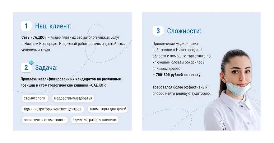 Сеть медицинских клиник «САДКО» столкнулась с трудностями в привлечении персонала, соответствующего ключевым критериям: наличие медицинского образования (для ряда вакансий – неоконченного), географическое расположение в Нижнем Новгороде и активный интерес к поиску работы. Использование стандартных работных сайтов не обеспечивало достаточного охвата целевой аудитории и приводило к получению нерелевантных заявок.