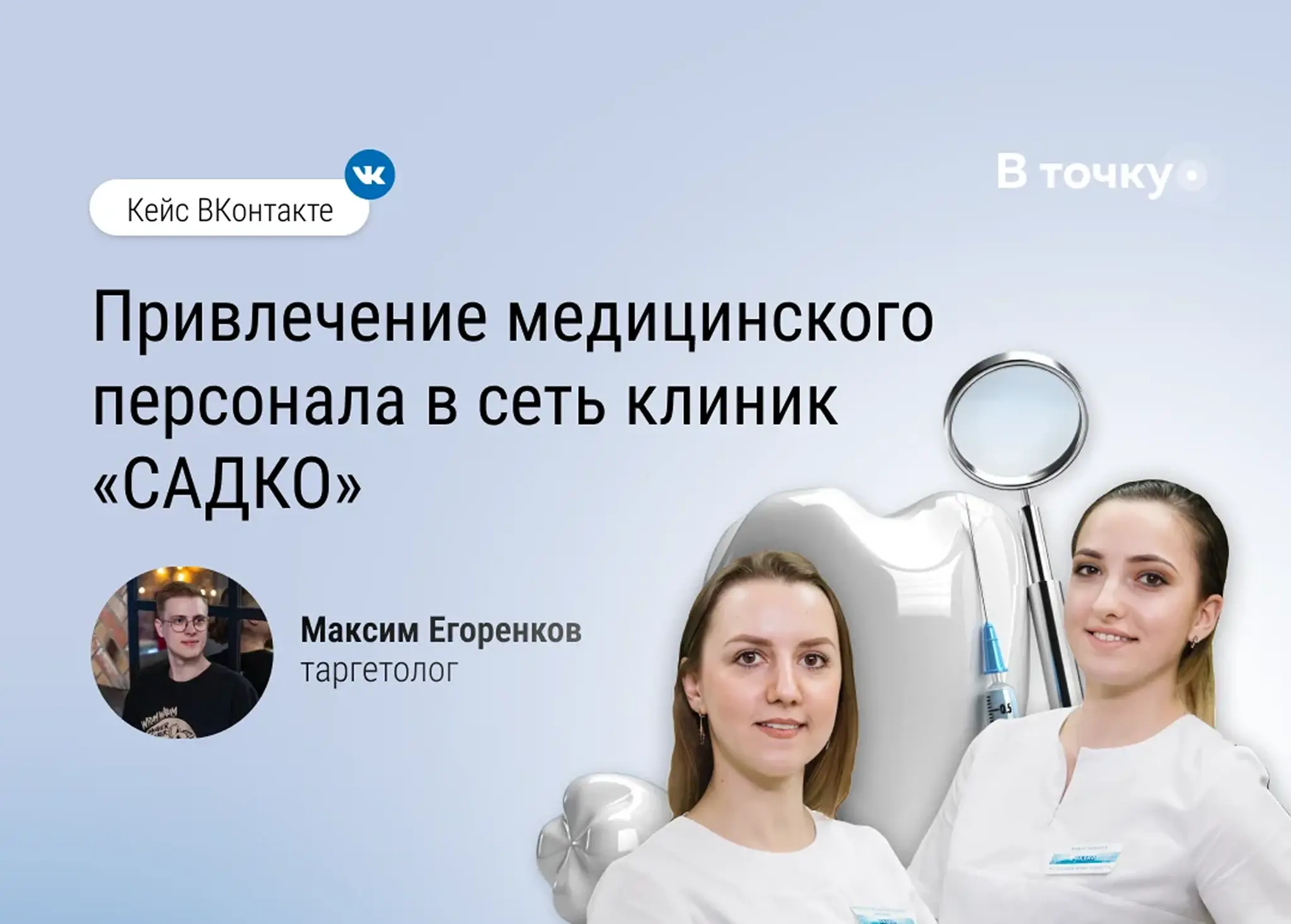 Приветствуем! Мы — агентство таргетированной рекламы «В точку». В этом кейсе мы собрали 1200 заявок на вакансии в сеть медицинских клиник «САДКО» с помощью таргетированной рекламы ВКонтакте, оптимизировав стоимость заявки в несколько раз за счет сегментирования аудитории и нестандартного подхода к таргетингу на кандидатов с медицинским образованием.