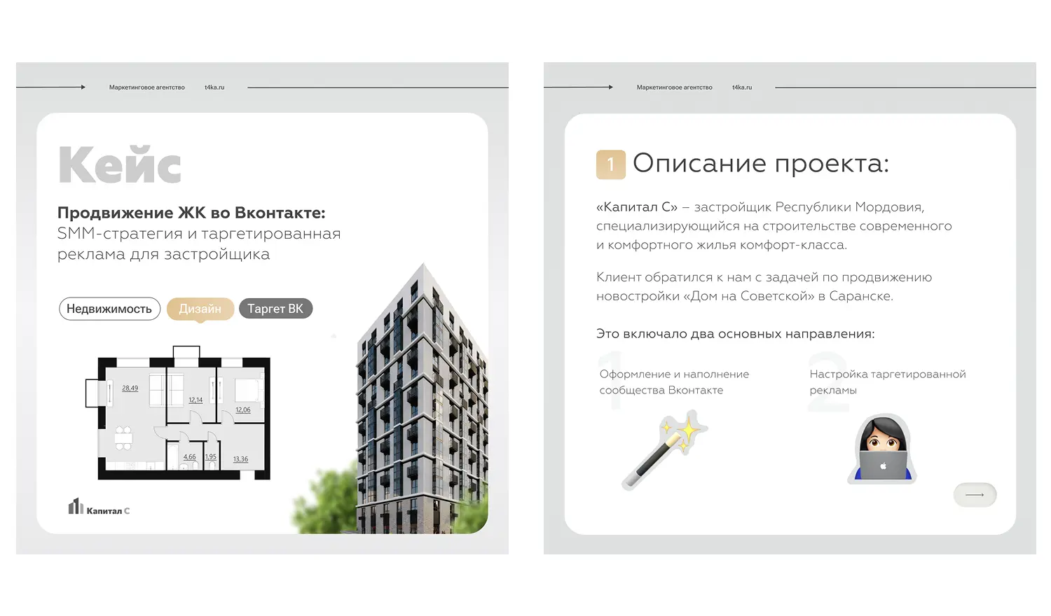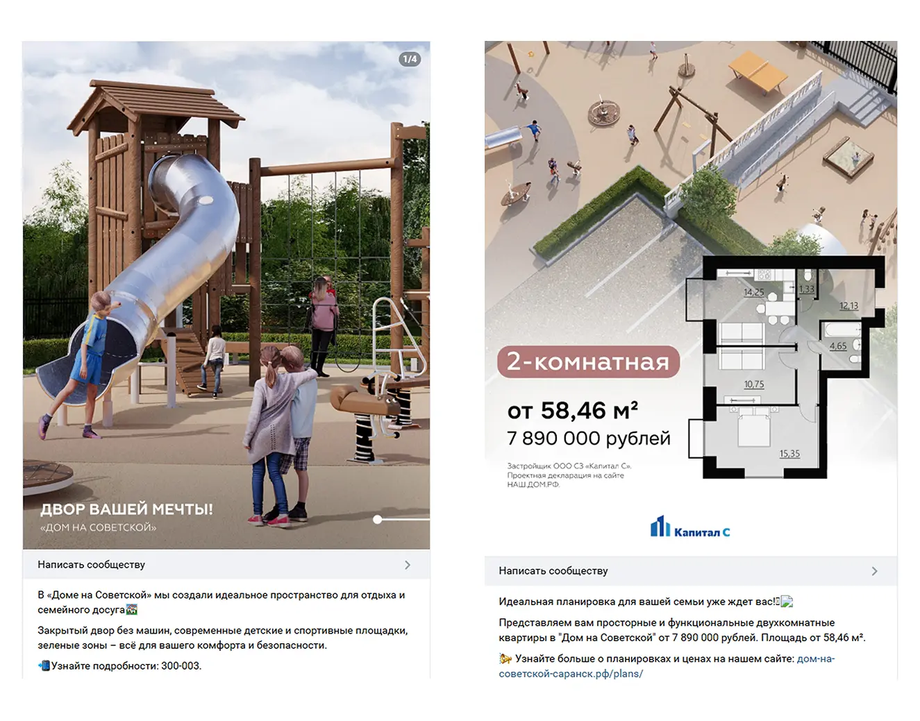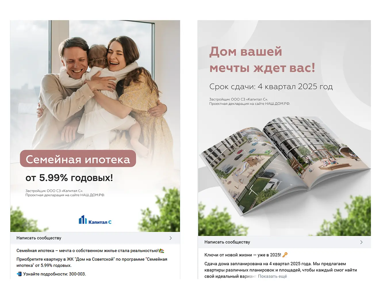 В рекламных креативах и текстах акцентировались следующие преимущества застройщика «Капитал С»: