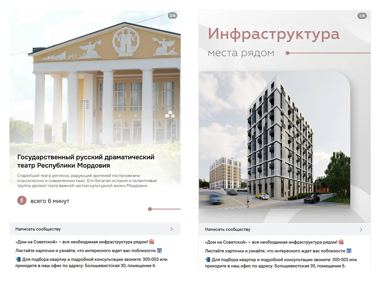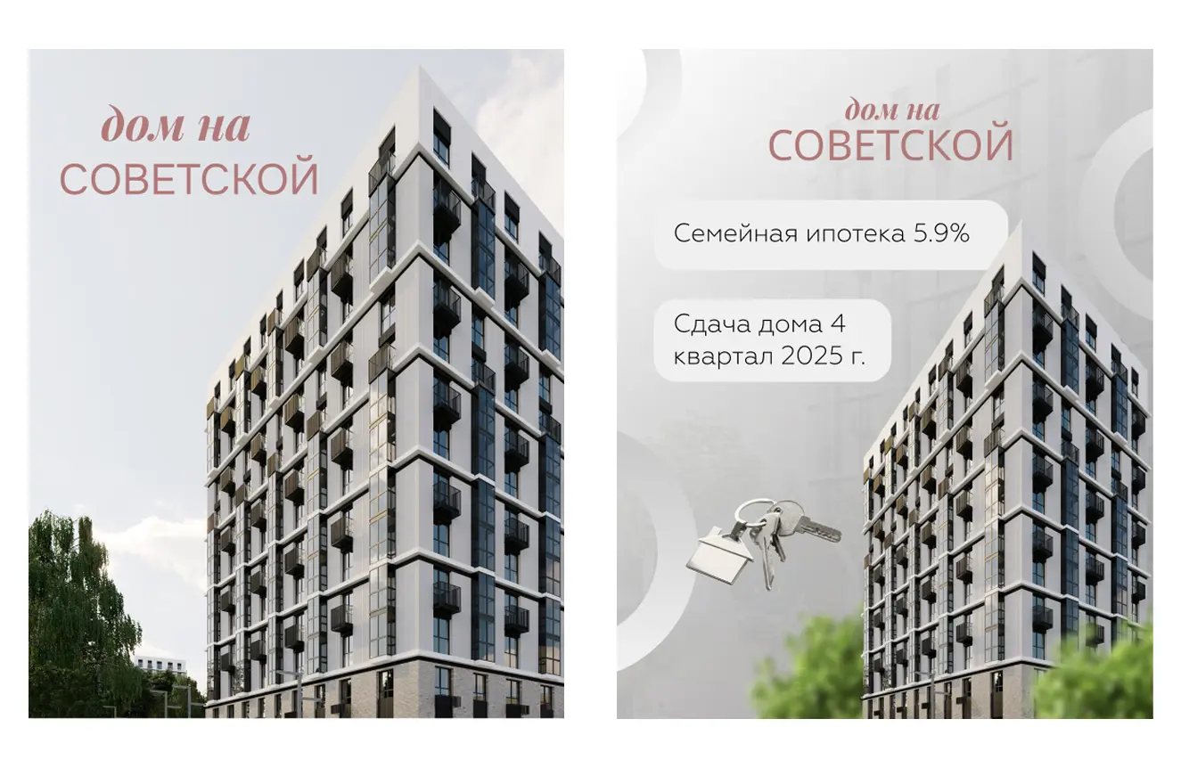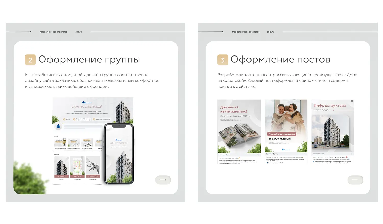 Разработали контент-план, рассказывающий о преимуществах «Дома на Советской». Каждый пост оформлен в едином стиле и содержит призыв к действию.