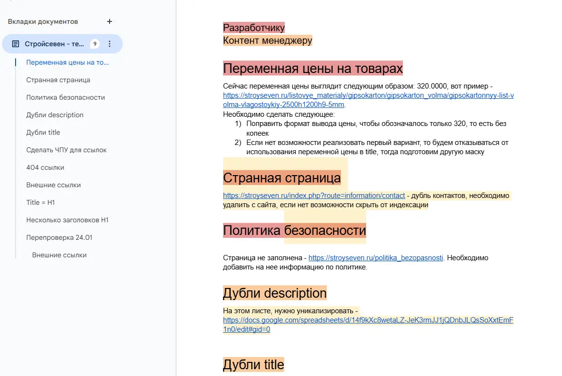 Помимо указанных проблем, новая версия сайта содержала ряд критических технических ошибок, которые требовали оперативного исправления. Среди них были проблемы с битыми ссылками, дублированием контента, некорректной разметкой и другими факторами, негативно влияющими на индексацию и ранжирование.