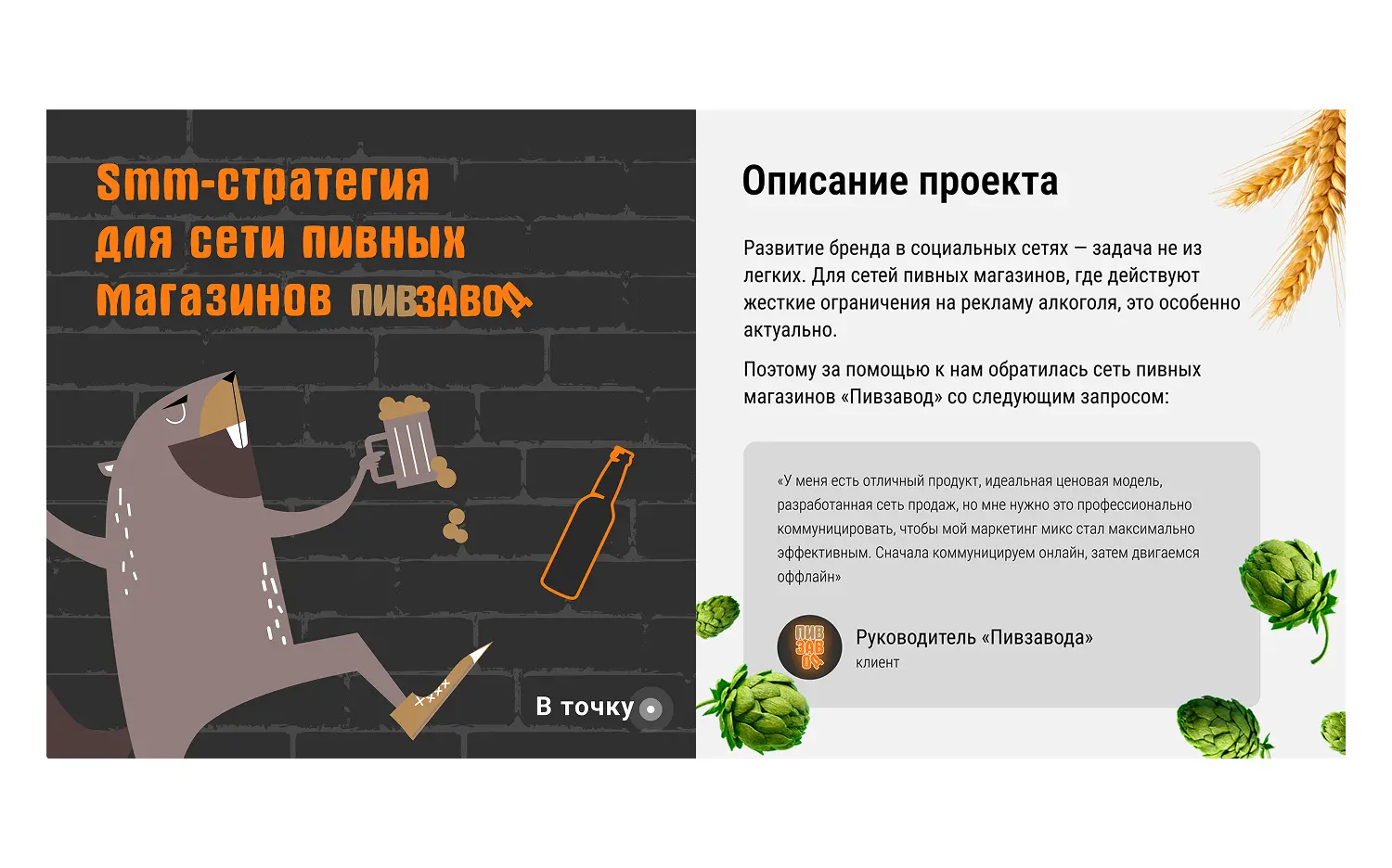 Всем привет! С вами пивные сомелье из SMM-агентства «В точку». В этом кейсе мы рассказываем, как для пермской сети магазинов «Пивзавод» провели тотальный ребрендинг и разработали SMM-стратегию с нуля. Мы полностью сменили визуал, создали харизматичного маскота-бобра и показали, как уйти от образа «обычной наливайки», чтобы стать главным пивным брендом города.