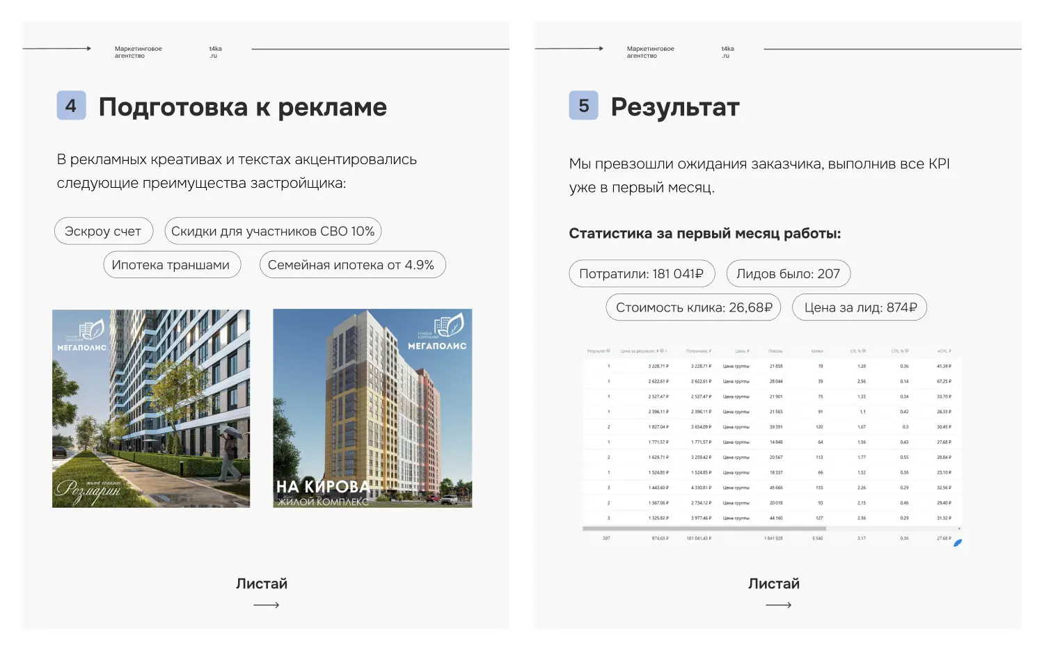 Мы разработали рекламные материалы, фокусируясь на преимуществах застройщика: выгодных скидках, регулярных акциях и различных вариантах оплаты. Вся реклама вела на удобную лид-форму, которая помогает быстро и эффективно собирать заявки от потенциальных клиентов, отсеивая при этом случайные обращения.