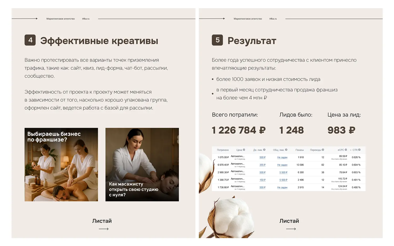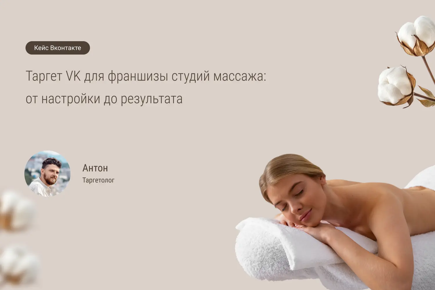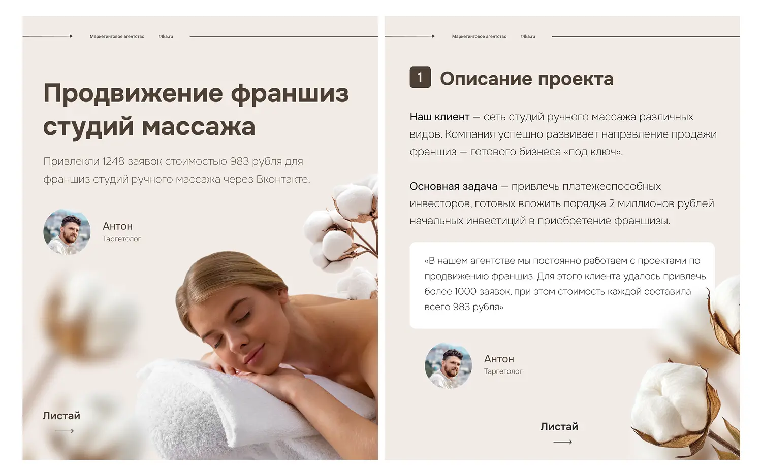 «Привет! Меня зовут Антон, я таргетолог. В нашем агентстве мы постоянно работаем с проектами по продвижению франшиз. Для этого клиента, продвигающего франшизу студий ручного массажа, через ВКонтакте удалось привлечь более 1000 заявок, при этом стоимость каждой составила всего 983 рубля»