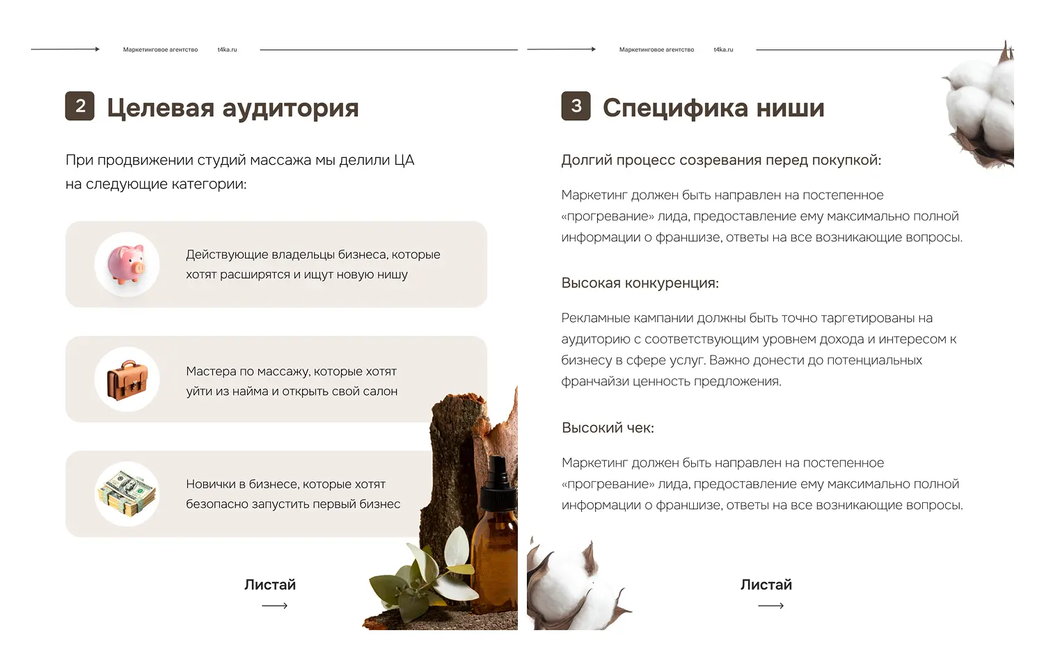 - Долгий процесс созревания перед покупкой. Решение о покупке франшизы студии массажа — это серьезный шаг, требующий тщательного обдумывания. Маркетинг должен быть направлен на постепенное «прогревание» лида, предоставление ему максимально полной информации о франшизе, ответы на все возникающие вопросы и сопровождение на всех этапах принятия решения.