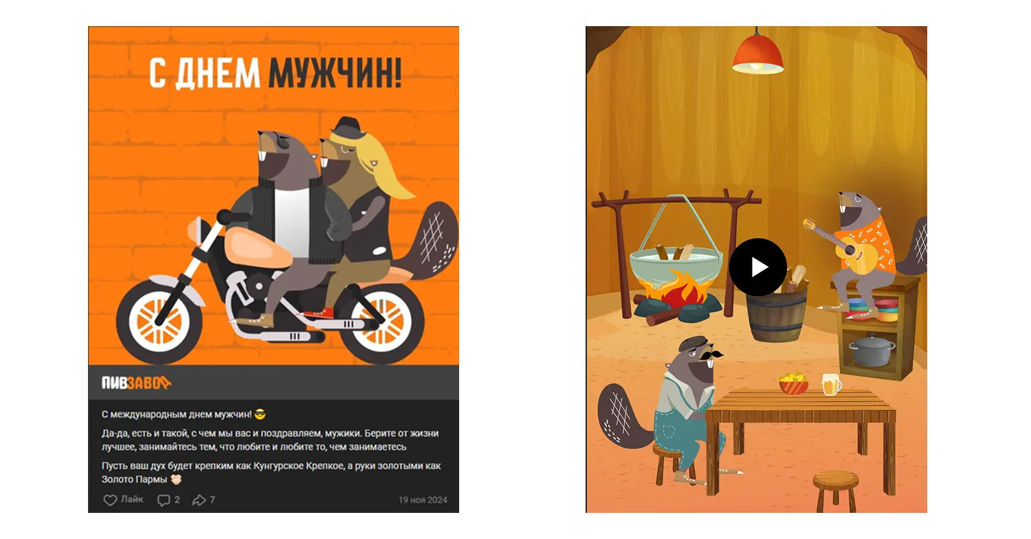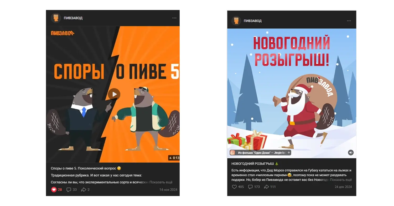 Все это мы интегрировали в контент-план. Как мы уже упоминали выше, каждый пост в этом сообществе — нечто экстраординарное. Если нам нужно повлиять на восприятие какого-либо продукта, мы упаковываем его в креативный сеттинг, связываем с культурной отсылкой или триггером (как, например, упомянутые ранее «Золото Пармы» и бобр-Гендальф, сидр «Боярский» и бобр-мушкетёр).