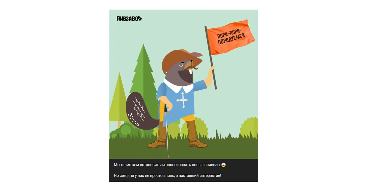 Если нам нужно распродать не самый популярный сидр — как вызвать к нему интерес? Изобразить бобра-мушкетёра, не упоминать название сидра, но пообещать первым трём угадавшим — литр сидра в подарок.