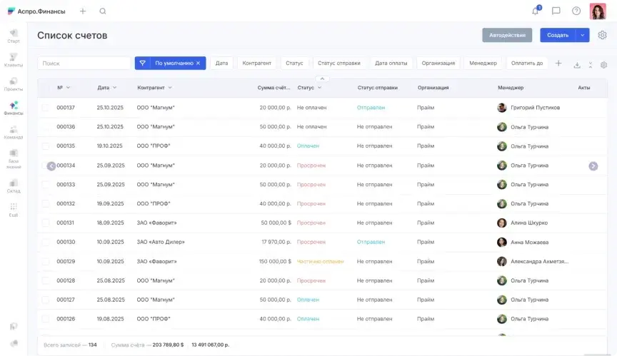 Автоматизация объединяет все методы управления финансами в одной системе. Руководители и сотрудники видят картину целиком: денежные потоки, прибыль, затраты и обязательства компании — в одном окне.