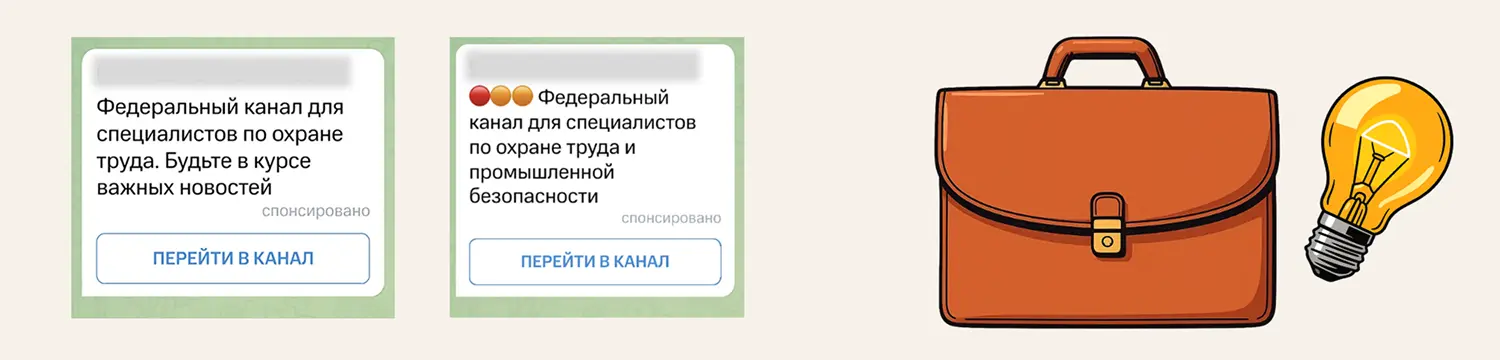 - Аудитории: активнее всего подписываются пользователи, которые уже состоят в Telegram‑каналах по охране труда; оптимальный размер источников — каналы с 3–7 тыс. подписчиков. Слишком крупные и разнотемные площадки давали хуже конверсию.
