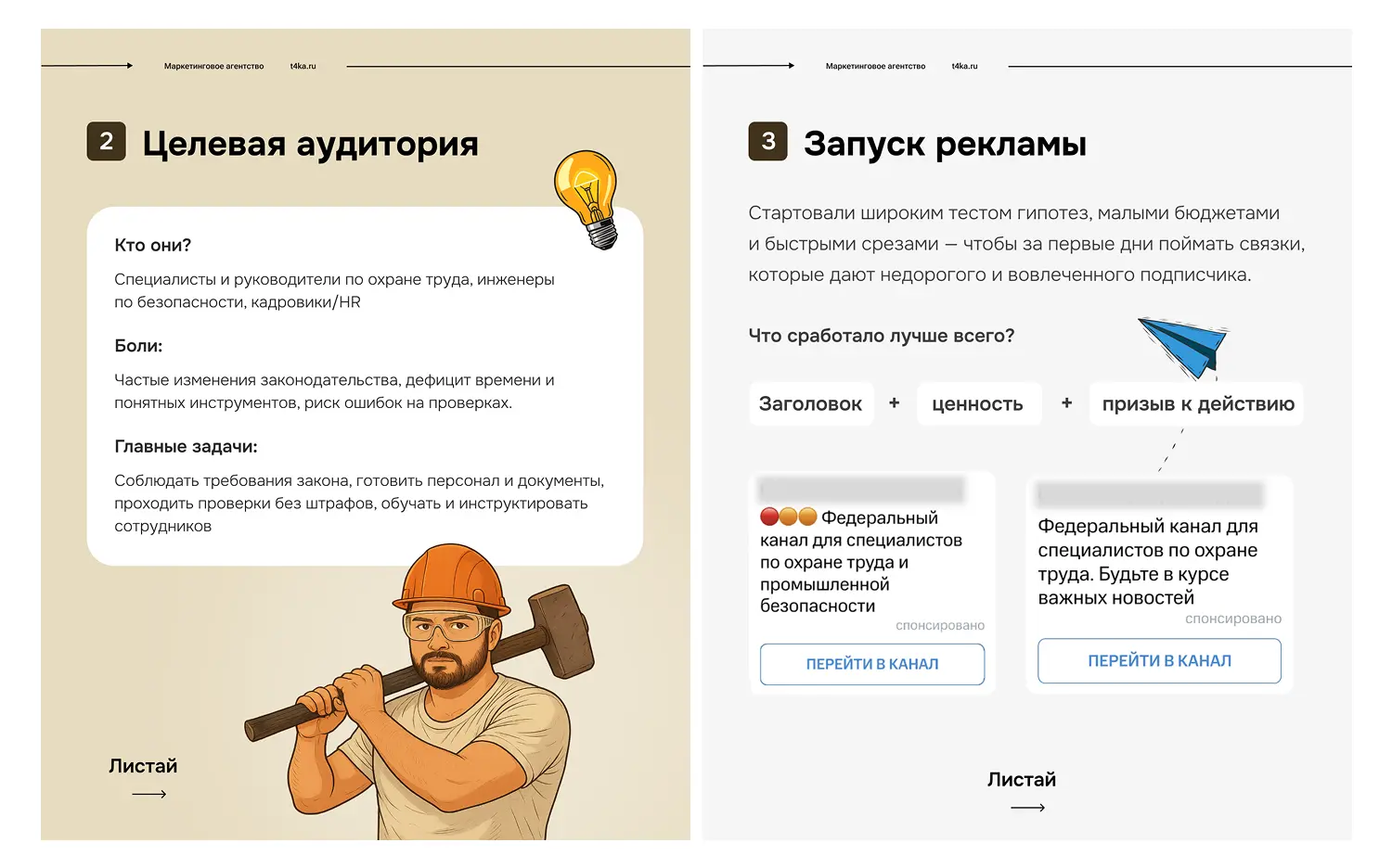 Прежде чем включать бюджет, мы провели короткий подготовительный спринт: изучили профильные каналы и интересы ЦА, собрали пул тем для объявлений (разборы изменений в законодательстве, травматизм и несчастные случаи, «что делать работодателю», чек‑листы и аналитика) и подготовили офферы под каждую тему.