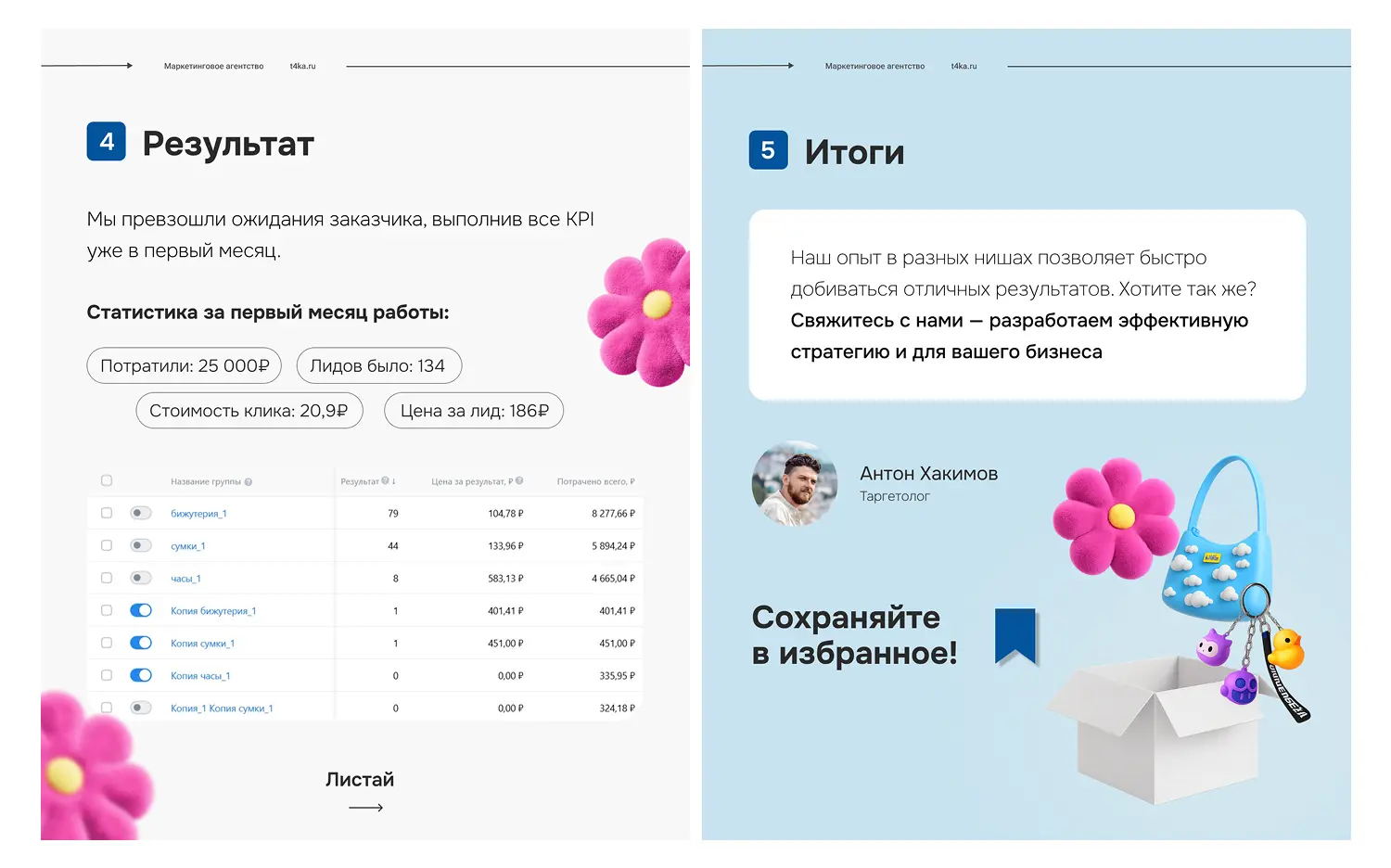 «Этот кейс наглядно демонстрирует, как грамотно спланированная и реализованная рекламная кампания может обеспечить значительный рост числа лидов при оптимальном использовании бюджета. Мы уверены, что наш опыт и профессионализм помогут вам достичь подобных результатов. Свяжитесь с нами сегодня, чтобы обсудить ваши маркетинговые цели и разработать эффективную стратегию для вашего бизнеса»
