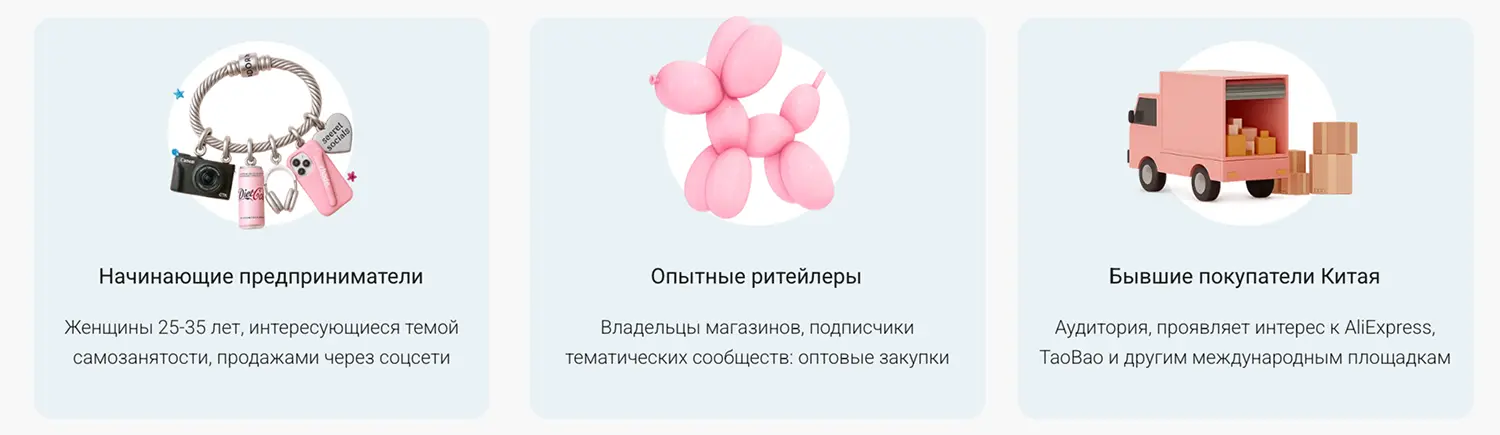 Прежде чем выбирать целевую аудиторию, мы провели короткий анализ: изучили продуктовую матрицу и средний чек, портрет текущих оптовых клиентов в CRM, активность конкурентов и поведенческие сигналы. На основе этого выделили несколько слоёв аудитории. Ядро составили подписчики сообществ конкурентов — пользователи с явным интересом к опту и закупкам.