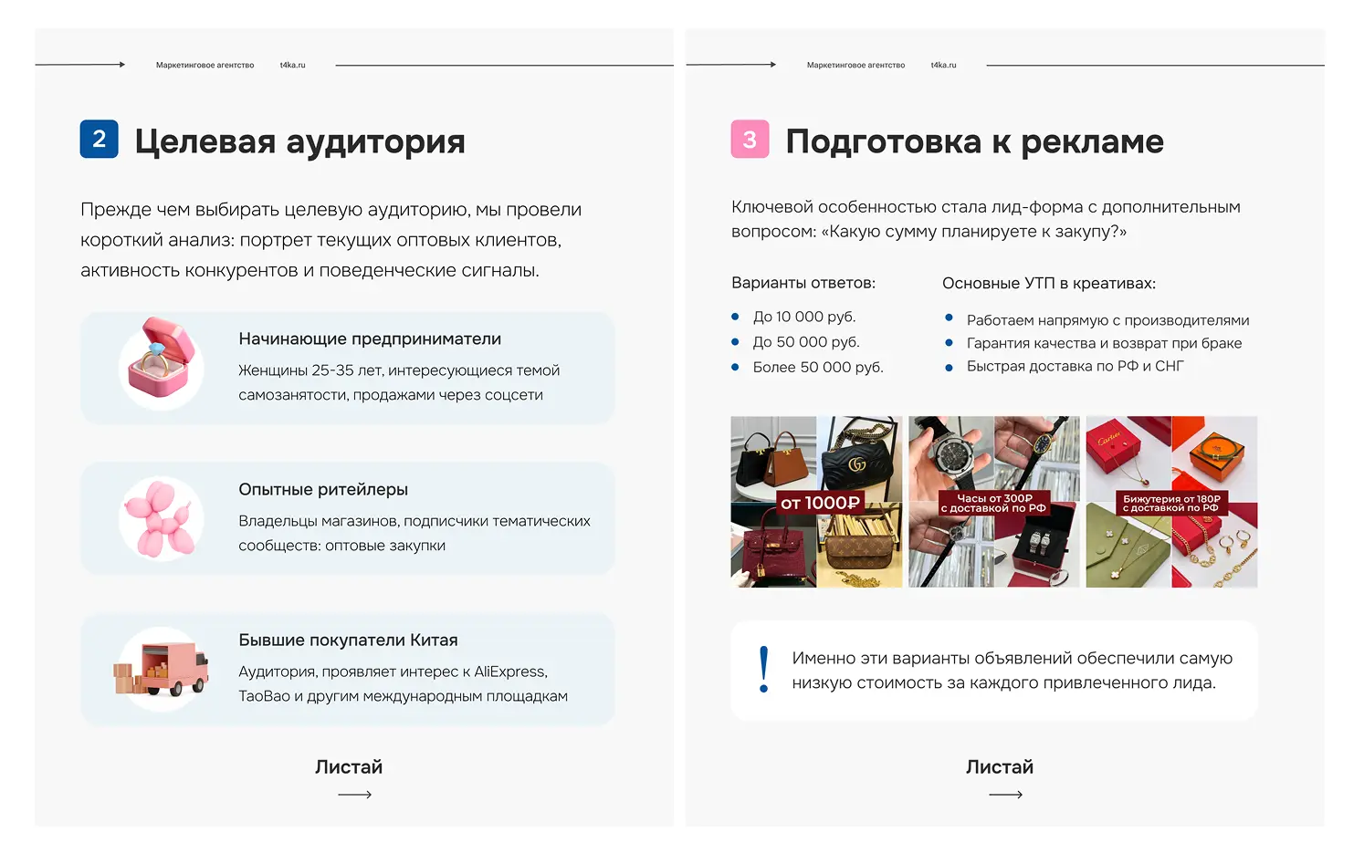 Клиент обратился к нам с задачей наладить стабильный поток целевых лидов из соцсетей с помощью таргетированной рекламы. Фокус — привлекать именно оптовых покупателей, снизить стоимость лида и отсечь «любопытных», не готовых к закупке.