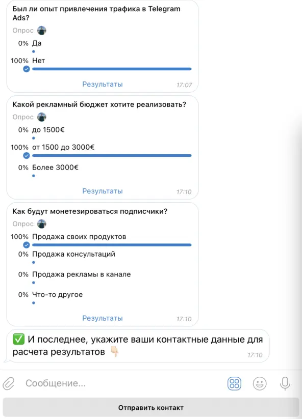 Всегда были популярны квизы, в которых человек отвечает на вопросы (тем самым мы квалифицируем его) и получает полезность или скидку за оставленный контакт. И я хотел внедрить что то подобное внутри телеграм, чтобы сохранить интерактив для лида, и заявки приходили в удобном формате тоже внутри телеграм.