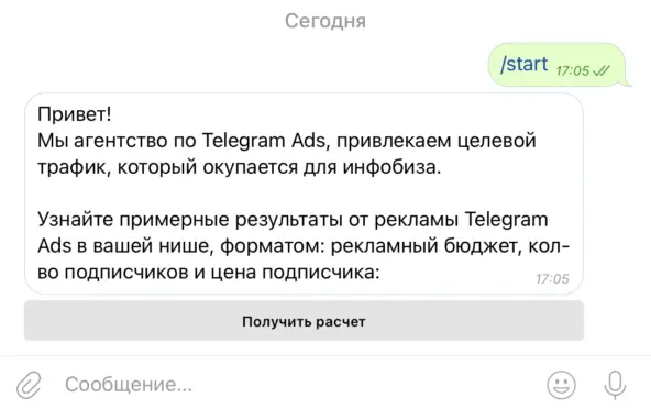 1. Человек нажимает кнопку «начать» в боте и ему сразу приходит приветственное сообщение с предложением получить подробный расчет примерных результатов от работы с нами