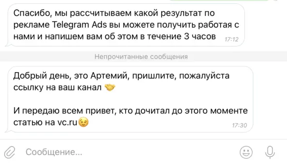 Если хотите запустить Telegram Ads на выгодных условиях — можете обратиться к моей команде, запустим все под ключ. Пишите мне в Telegram, а также подписывайтесь на блог в нем рассказываю, как привлекаю подписчиков себе с помощью Telegram Ads и какая стоимость получается.