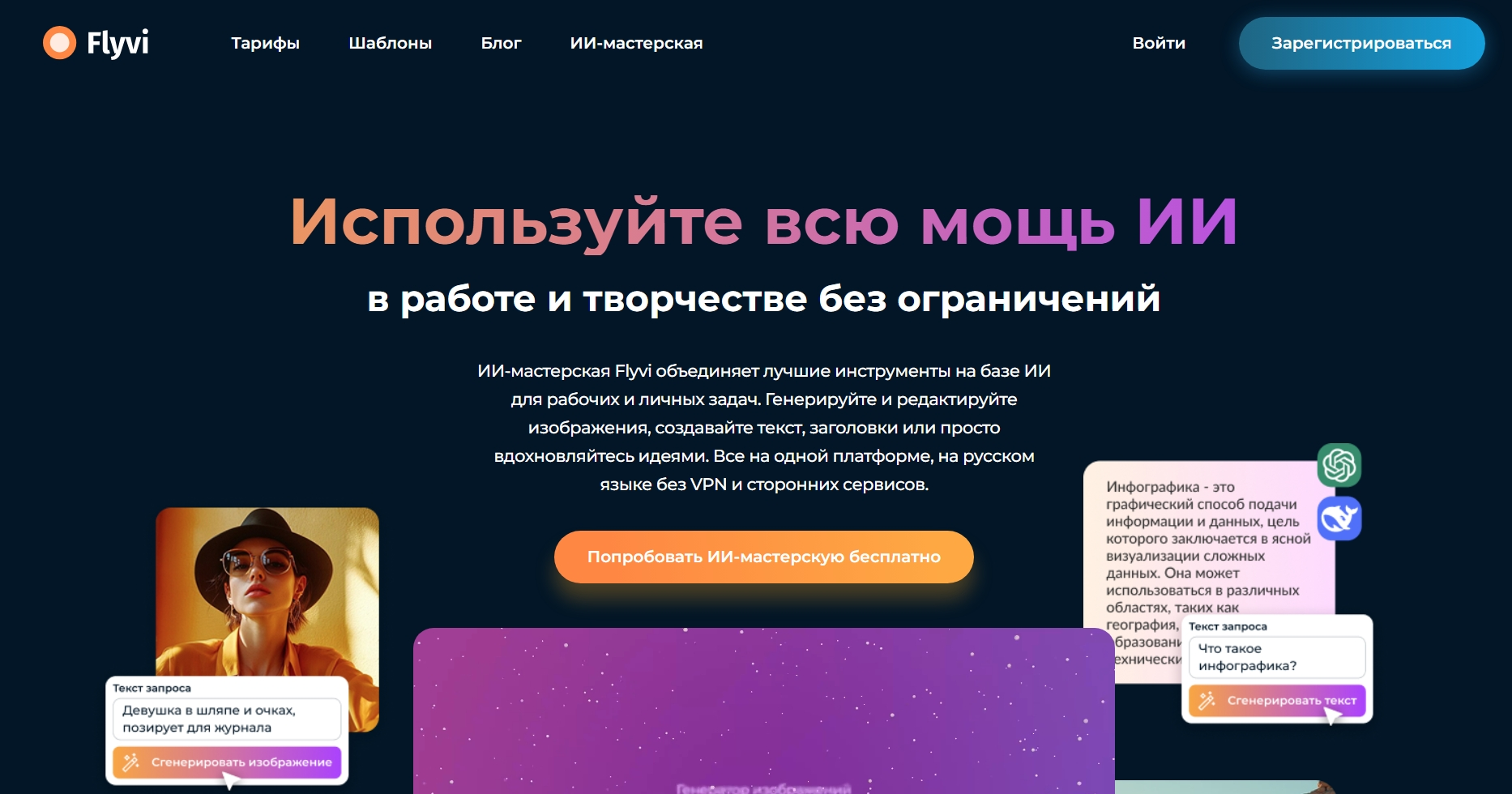 Сервис для создания визуального контента, объединяющий AI-генерацию изображений с профессиональными инструментами редактирования в едином интерфейсе. Создавайте профессионально оформленные визуалы для Instagram, Facebook, ВКонтакте и других социальных сетей без навыков дизайна, ведь достаточно описать желаемое изображение текстом, а нейросеть создаст идеальный вариант с возможностью добавления фирменных элементов через встроенный Брендбук. Flyvi предлагает полный спектр функций для работы с изображениями: удаление и замена фона или отдельных объектов, улучшение качества фотографий, увеличение разрешения, дорисовка утерянных фрагментов и раскрашивание черно-белых снимков с сохранением аутентичности, дополненные классическими фильтрами редактирования для достижения идеального результата.