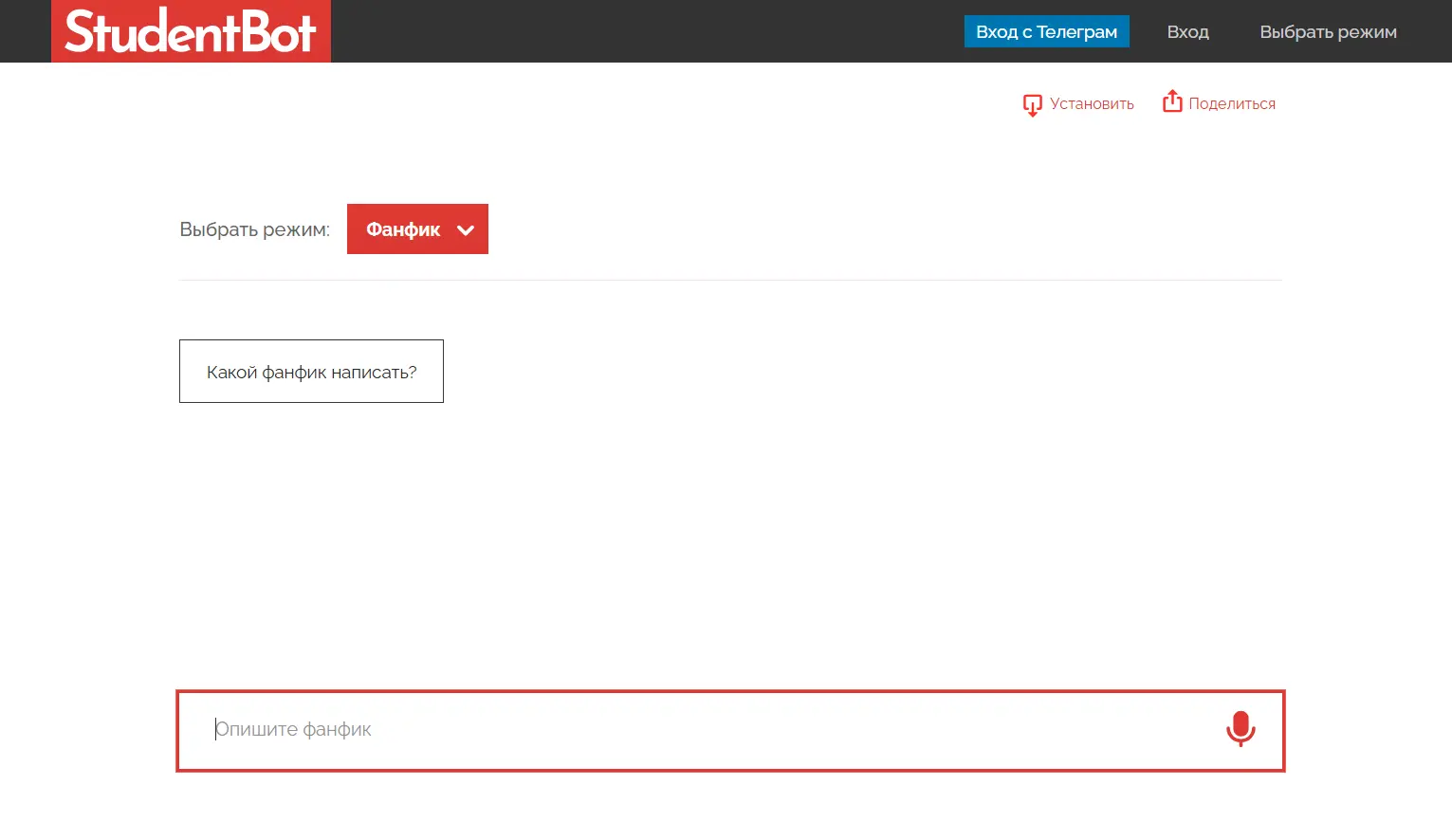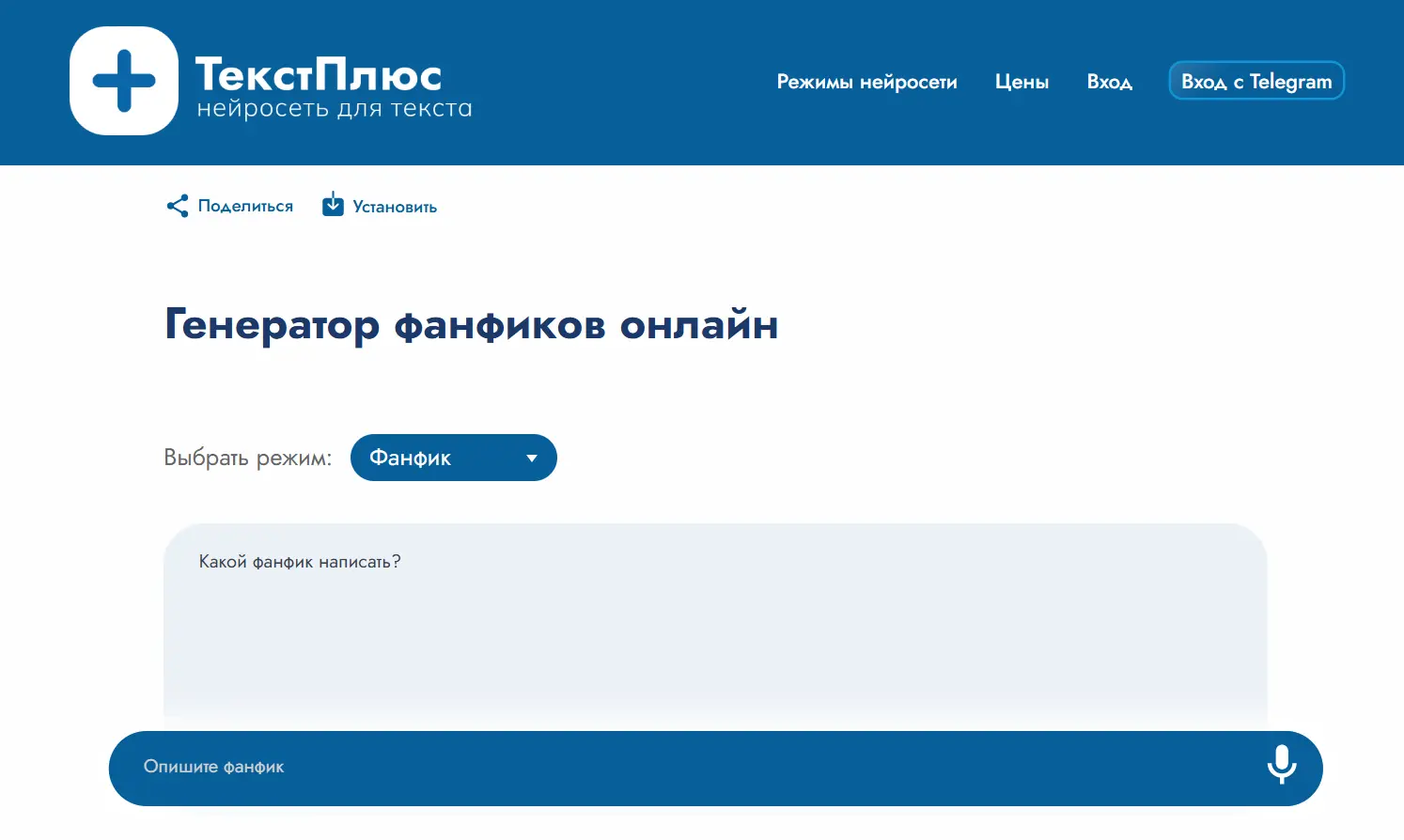 - Возможности: генерация фанфиков, продолжение текста, подбор идеи, обмен историями, общение с сообществом