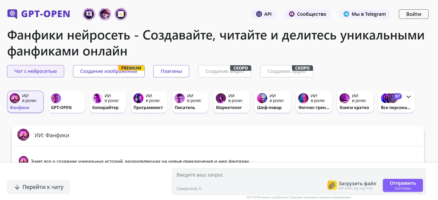 - GPT-OPEN — режим «Фанфики» в чат-сервисе: выбираете роль бота, вселенную, получаете развернутые истории и можете их продолжать.
