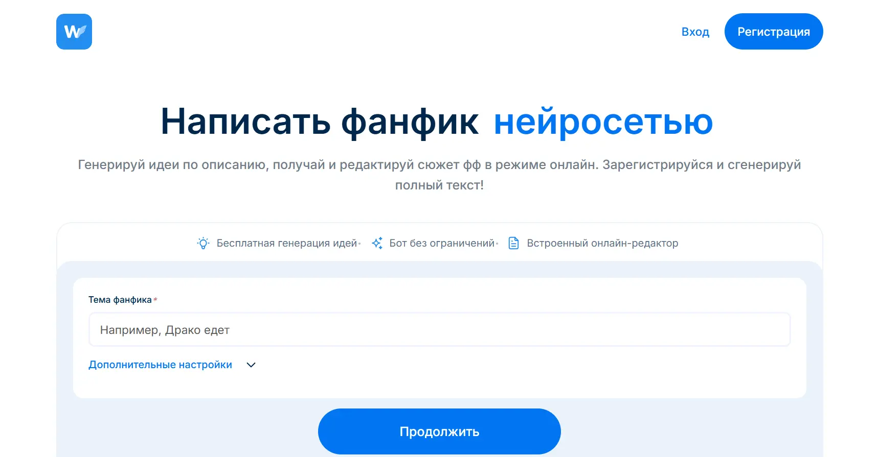 - Возможность быстро получить сюжет или фанфик‑заготовку, экономя время и силы