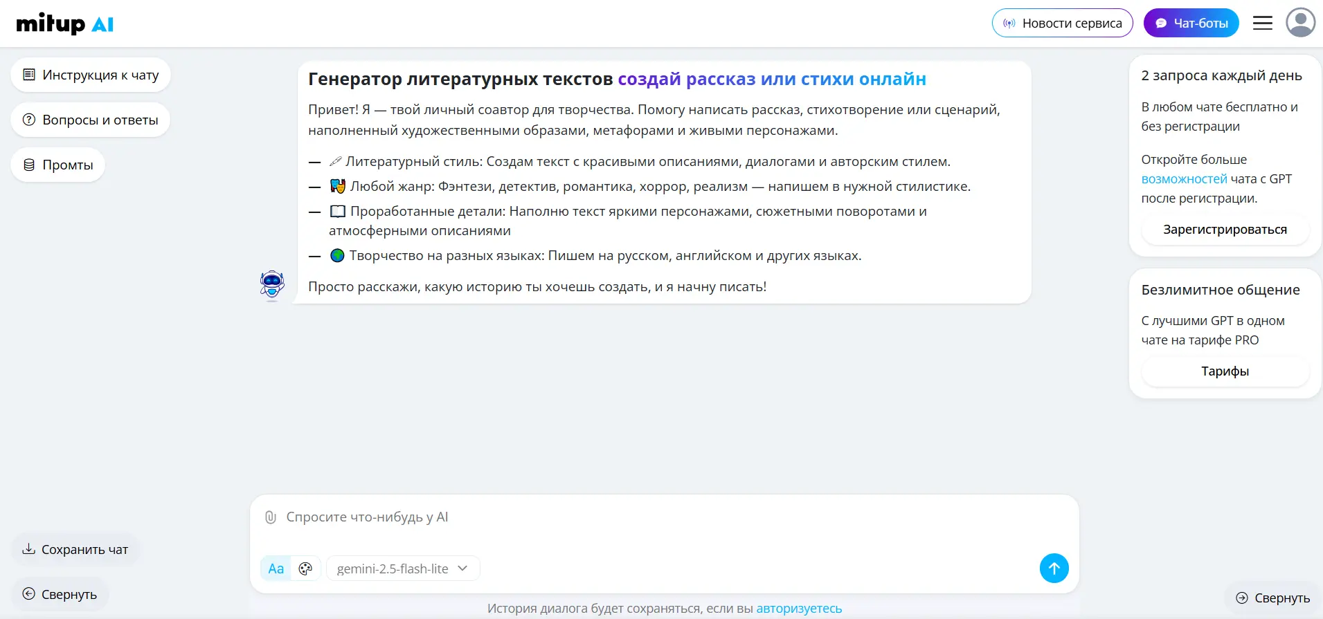 - MitupAI — универсальный ИИ-сервис: фанфики, посты, сценарии, промотексты, один личный кабинет и библиотека готовых промтов.