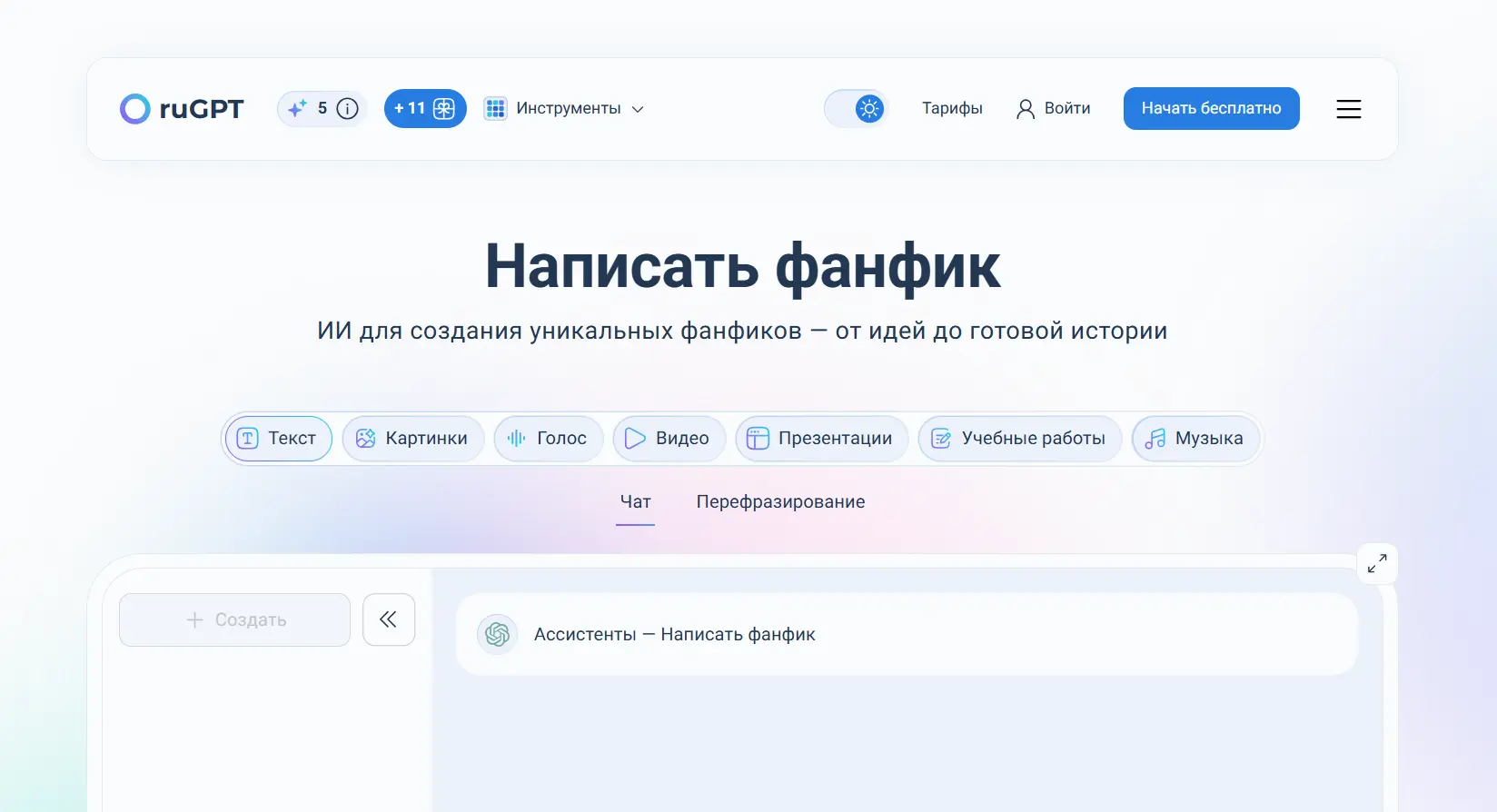 ИИ для создания фанфиков, включающий площадку для творческого сообщества. Сервис выделяется тем, что позволяет не только писать фанфики, но и делиться ими с другими пользователями, вдохновляться чужими историями и работать с текстами в одном кабинете. Он отлично подойдет авторам‑любителям, студентам и тем, кто хочет быстро создать фанфик без сложных настроек. Особая фишка — интеграция генерации фанфиков с другими инструментами по написанию и редактированию текстов внутри одного сервиса.