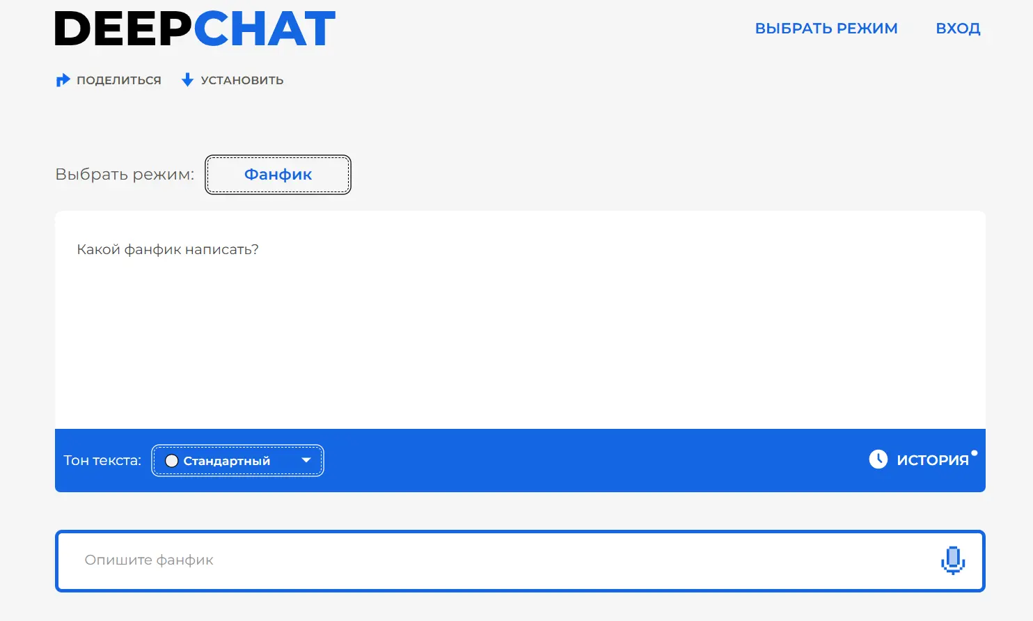 - DeepChat — онлайн-чат с нейросетью, генерирующей фанфики по описанию персонажей, сеттинга и желаемого эмоционального настроения.