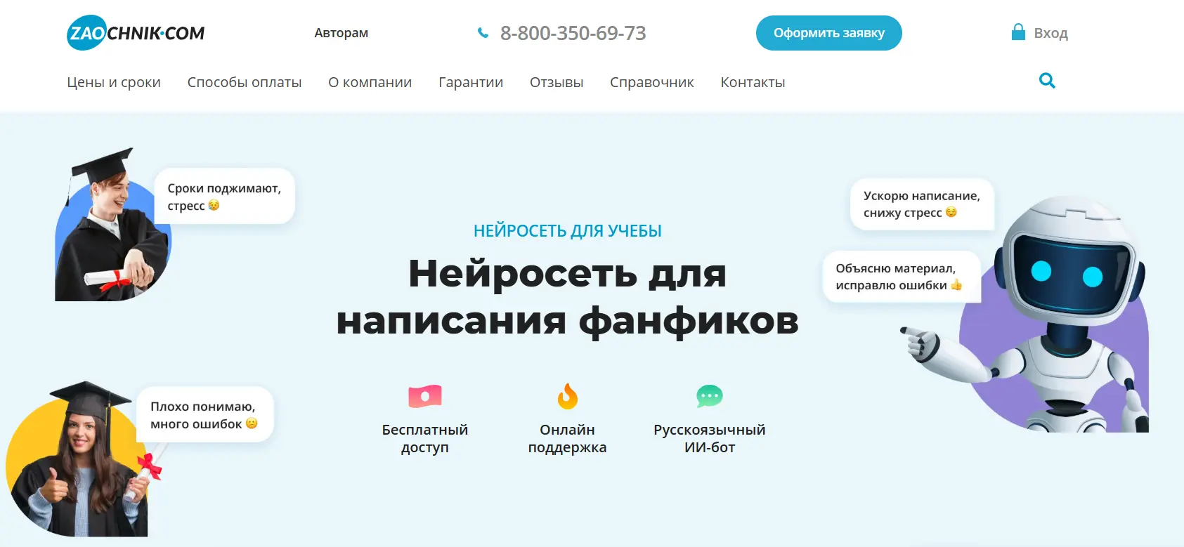 - Zaochnik — чат с ИИ: создает фанфики по короткому запросу, помогает доработать текст и адаптировать стиль под задачу.