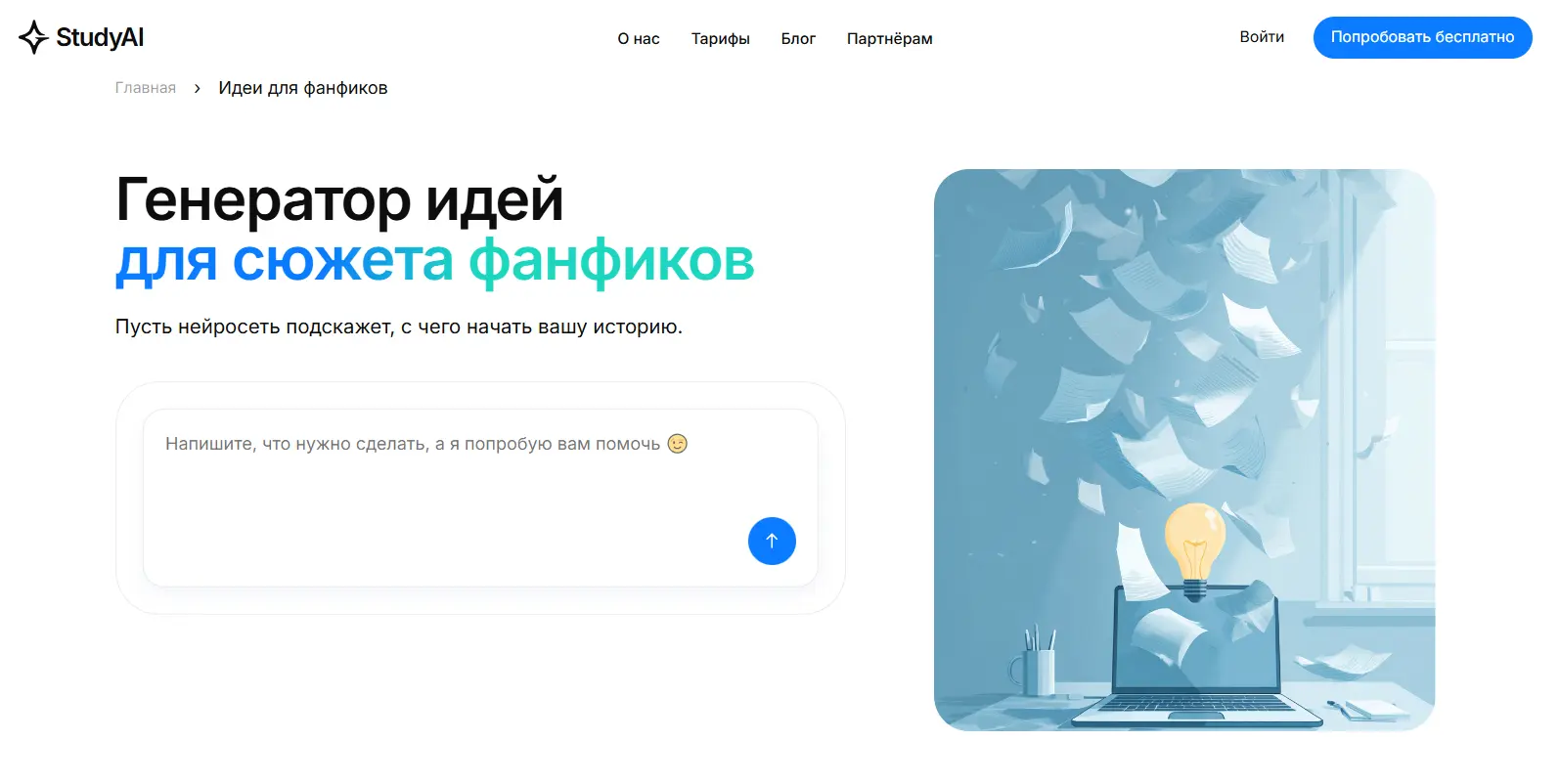 - StudyAI — генератор фанфиков с готовыми шаблонами сюжетов, выбором моделей и удобным русским интерфейсом для новичков и авторов.