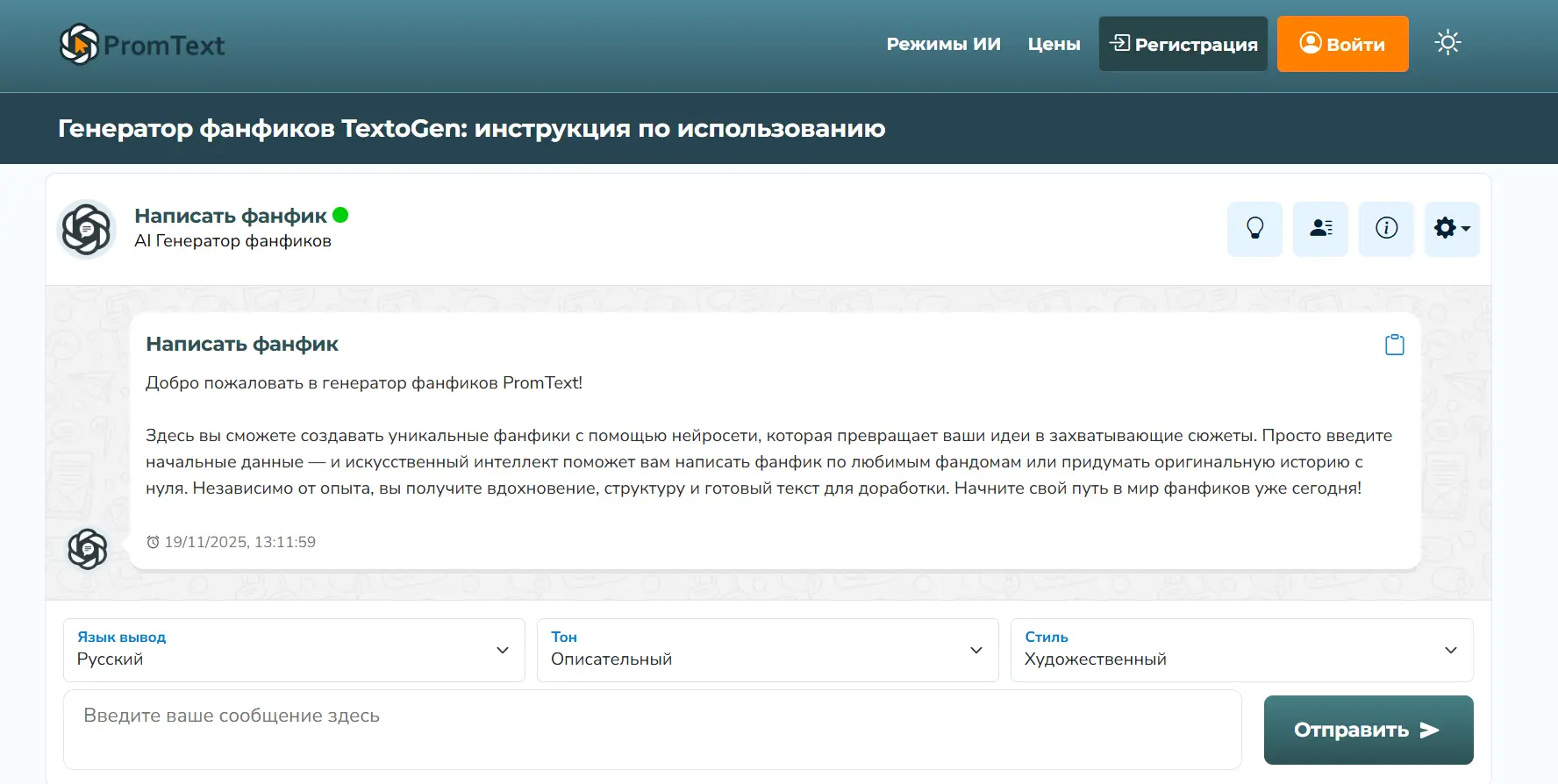 - PromText — генератор фанфиков с тонкой настройкой промтов: указываете фэндом, жанр, рейтинг, стиль повествования и желаемый объем.