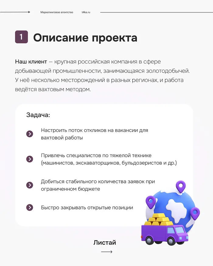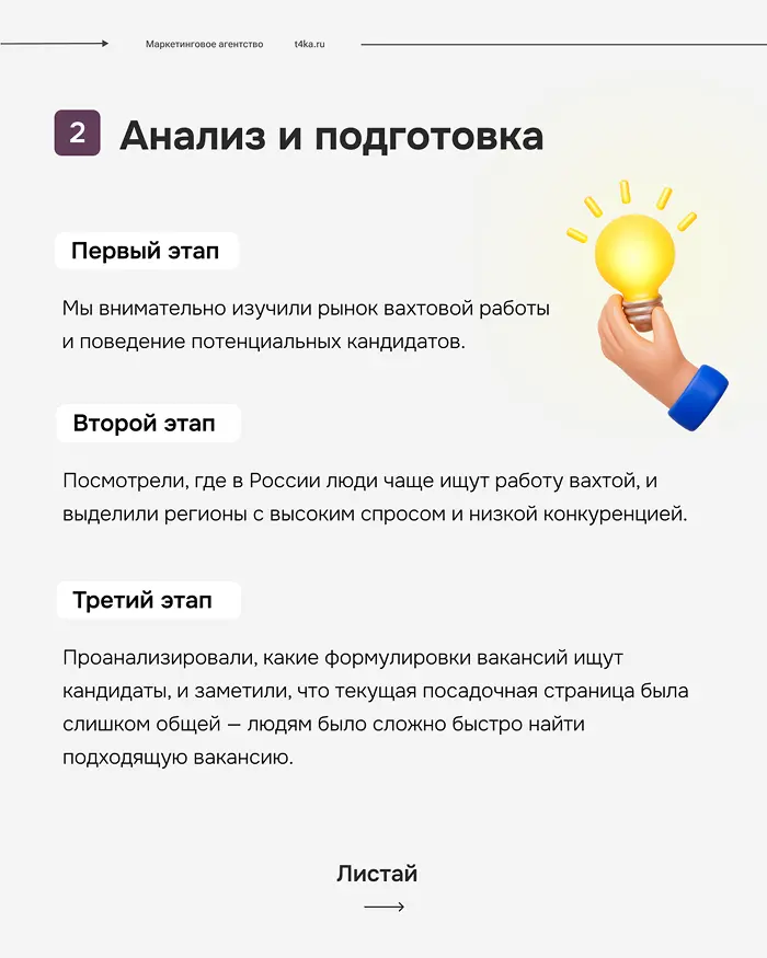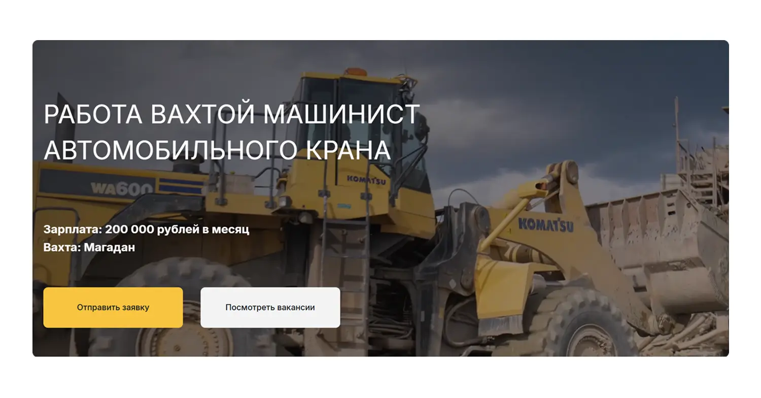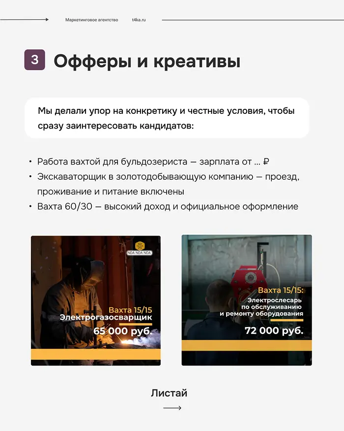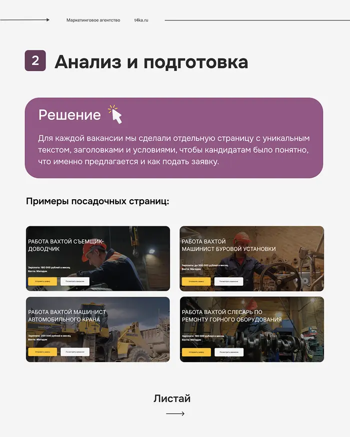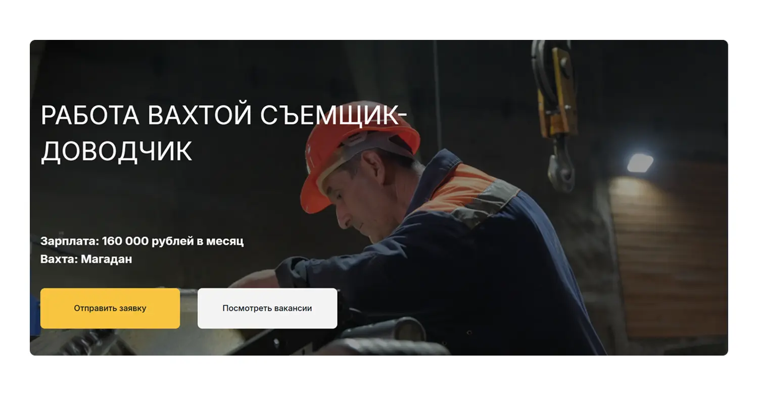 После запуска мы постоянно следили за результатами: сколько людей оставляют страницу без заявки, сколько стоит клик и сколько приходит заявок. На основе этих данных улучшали тексты и заголовки на лендингах, тестировали разные акценты — например, «зарплата», «вахта» или «проживание», чтобы понять, что привлекает больше кандидатов.